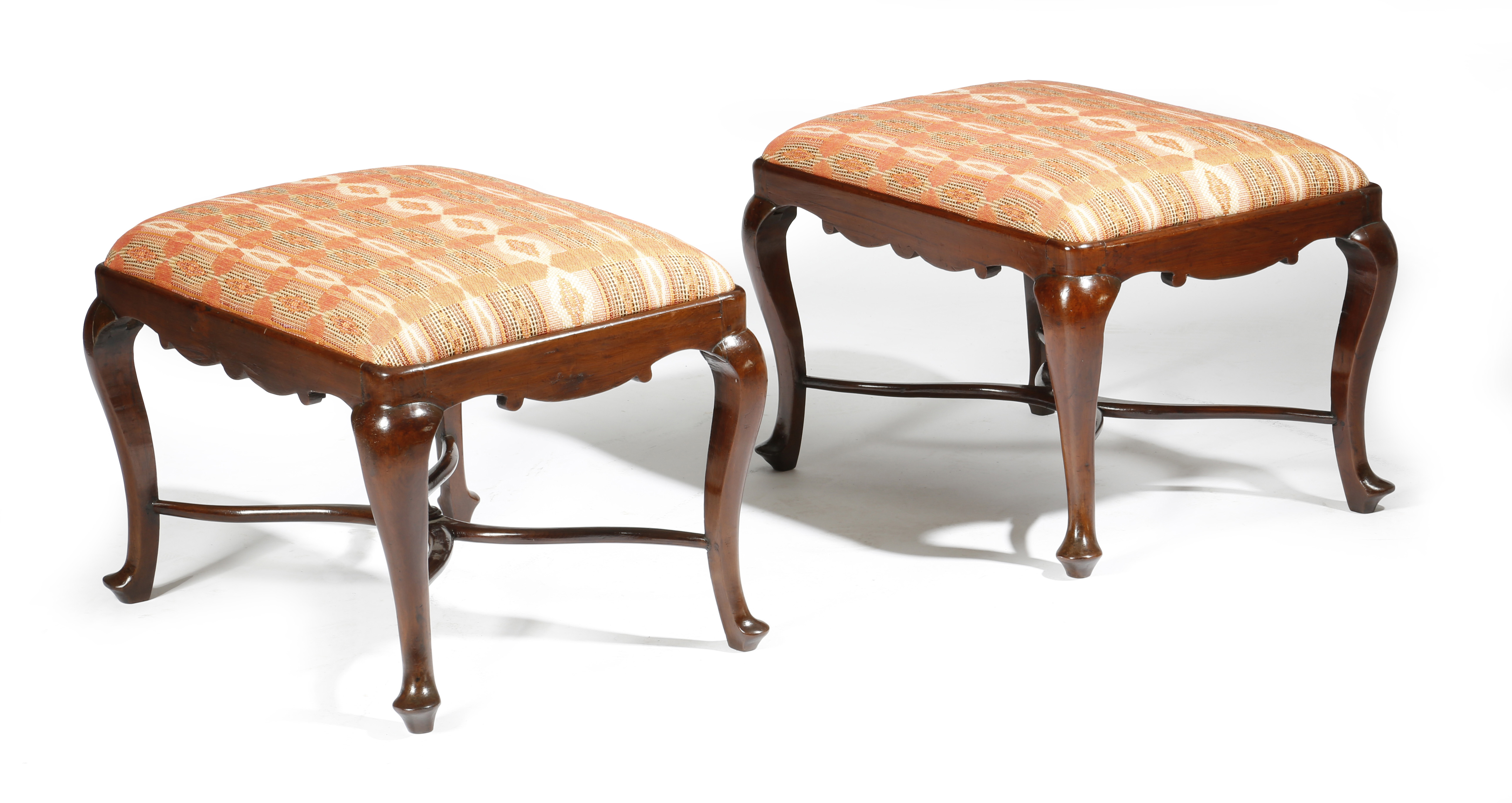 A pair of 18th century continental yew wood stools, each with a later drop-in needlework seat, with a shaped frieze, on cabriole legs united by an 'X' stretcher with a turned finial, 39.4cm high, 56.5cm wide, 41.5cm deep. (2)