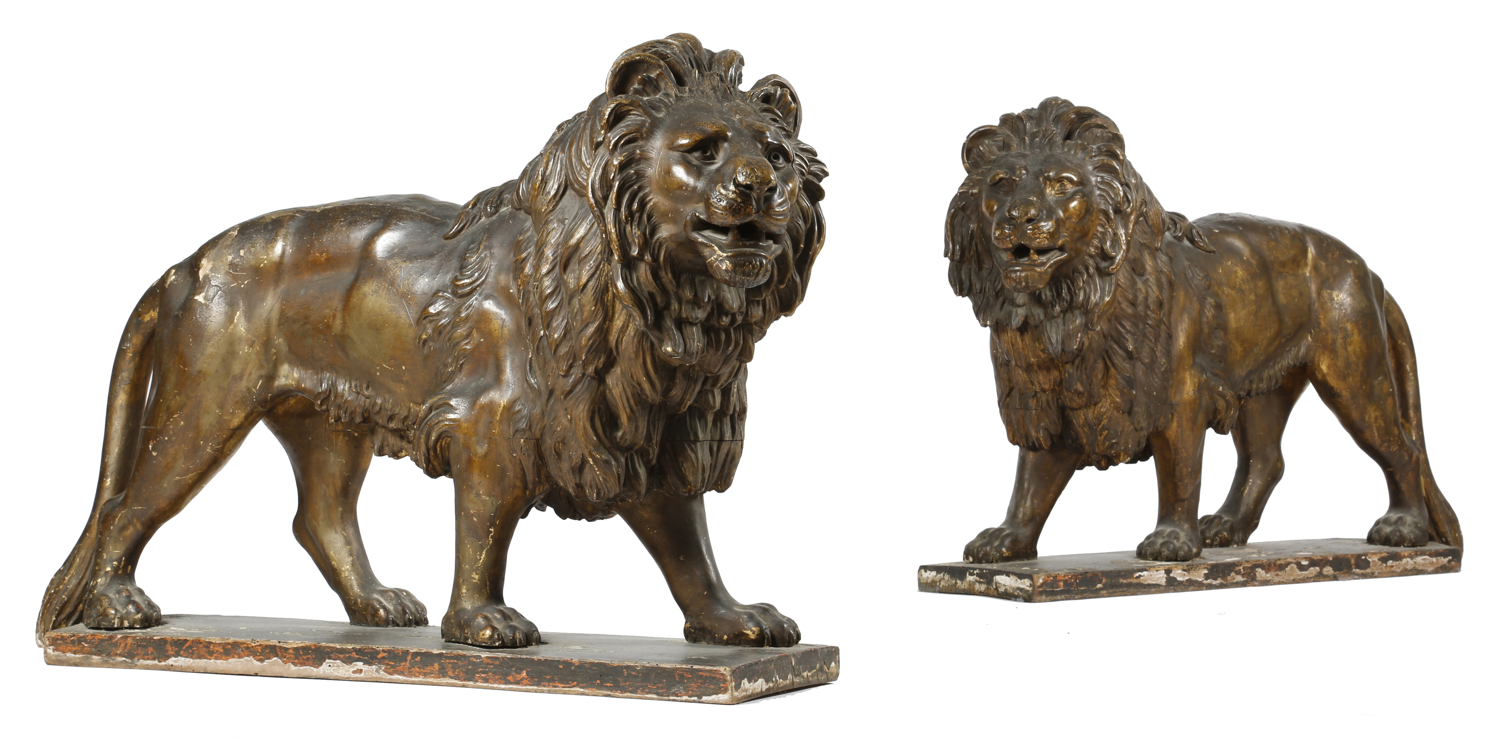 A pair of large 19th century French carved wood models of pacing lions, each with a gilt bronzed finish and on a rectangular plinth, 74.2cm high, 107cm long. (2)