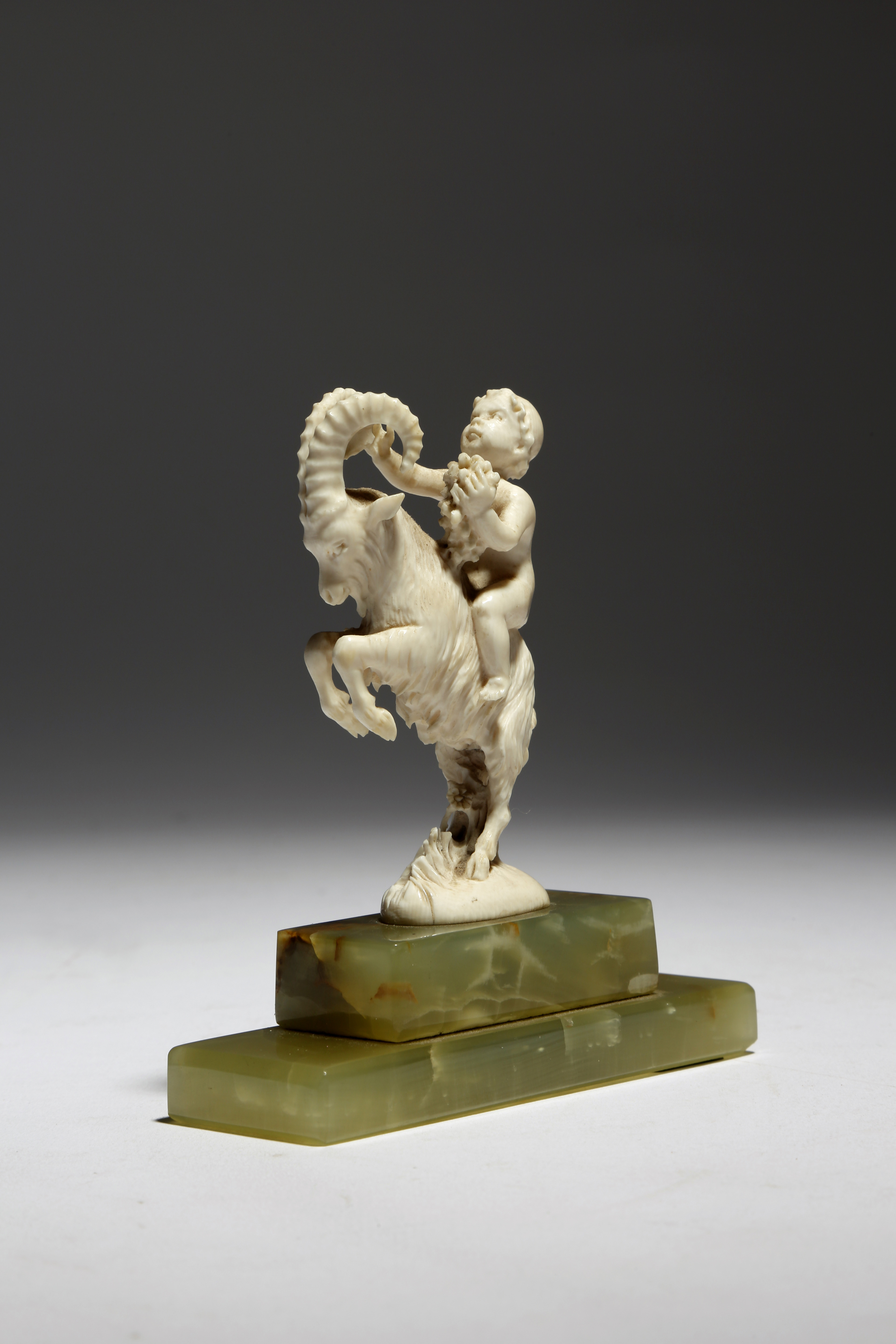 λ An Art Deco carved ivory group of a cherub riding a ram in the manner of Ferdinand Preiss