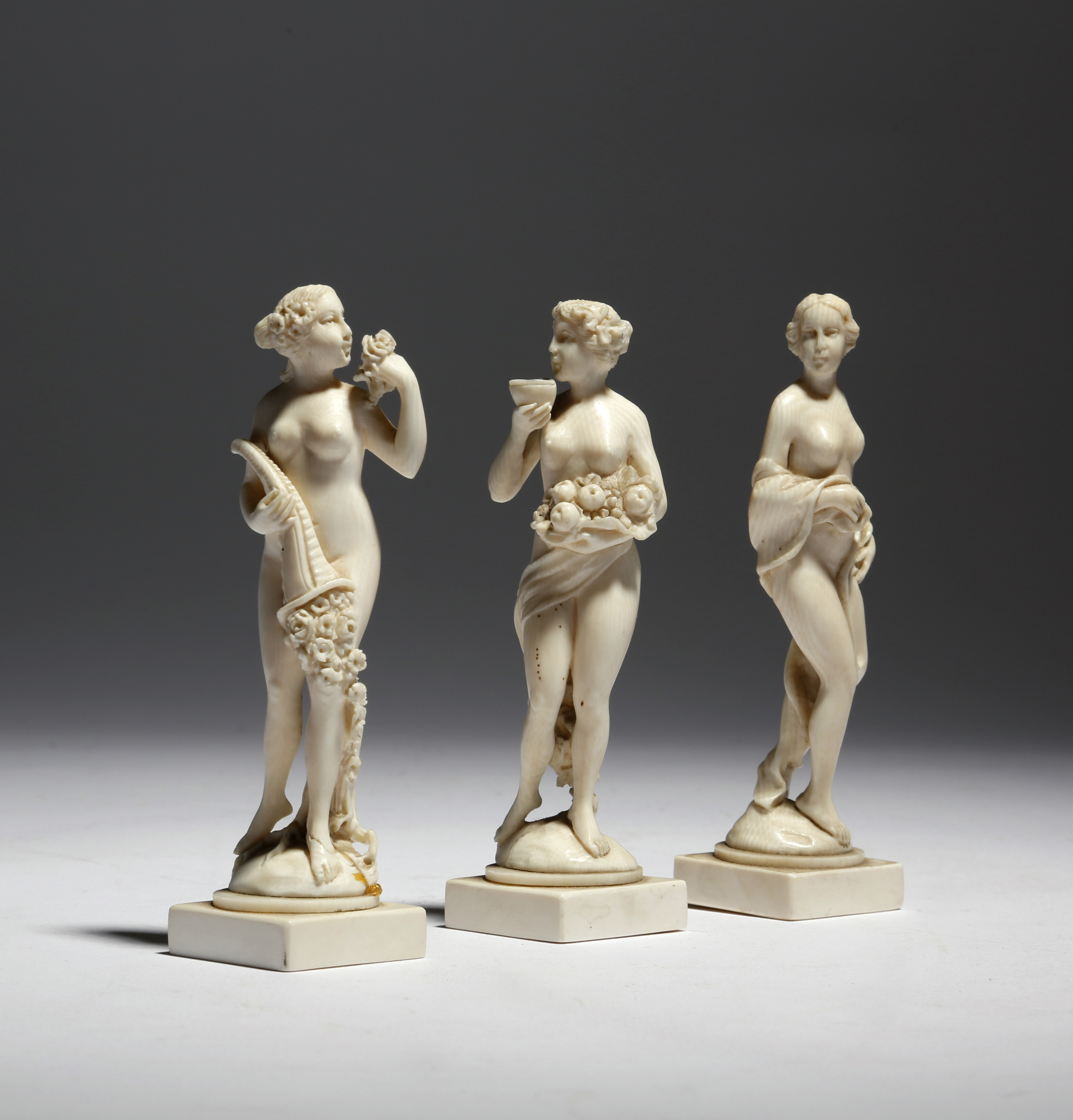λ Three French Dieppe carved ivory figures of the 'Four Seasons', each on a square base, late 19th / early 20th century, 11.3cm high. (3)