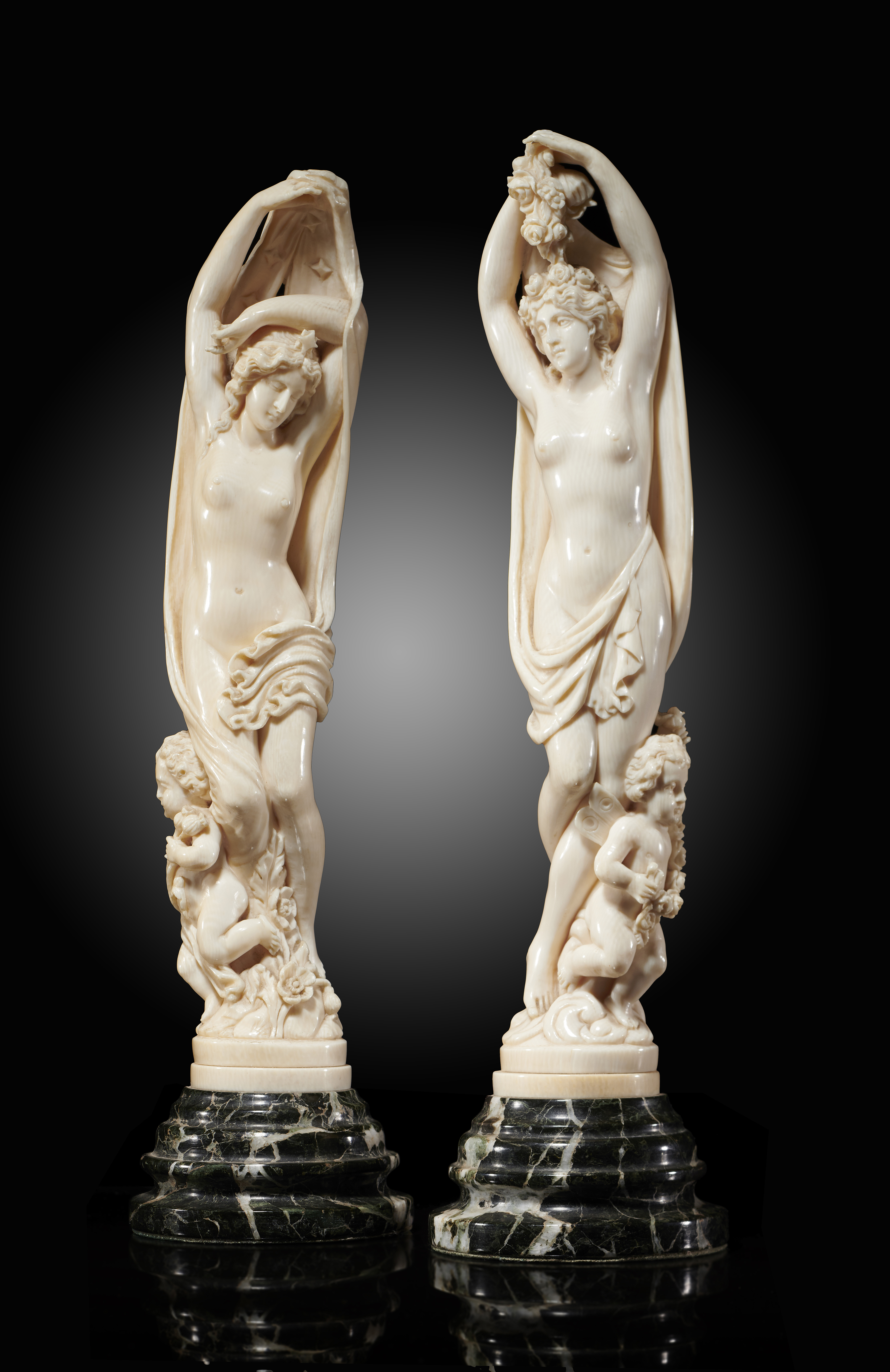 λ A pair of French Dieppe ivory figures of Night and Day after Jean-Jacques Pradier, each carved in the form of a scantily clad maiden accompanied by a cherub, carved with flowers and stars, each on a verde antico socle, the underside of one with an old handwritten paper label inscribed 'DAY AND NIGHT BY ALBERT TOFT FROM THE FITZROY COLLECTION 100 GUINEAS', late 19th / early 20th century, the figures: 29.5cm high, overall: 34.3cm high. (2)