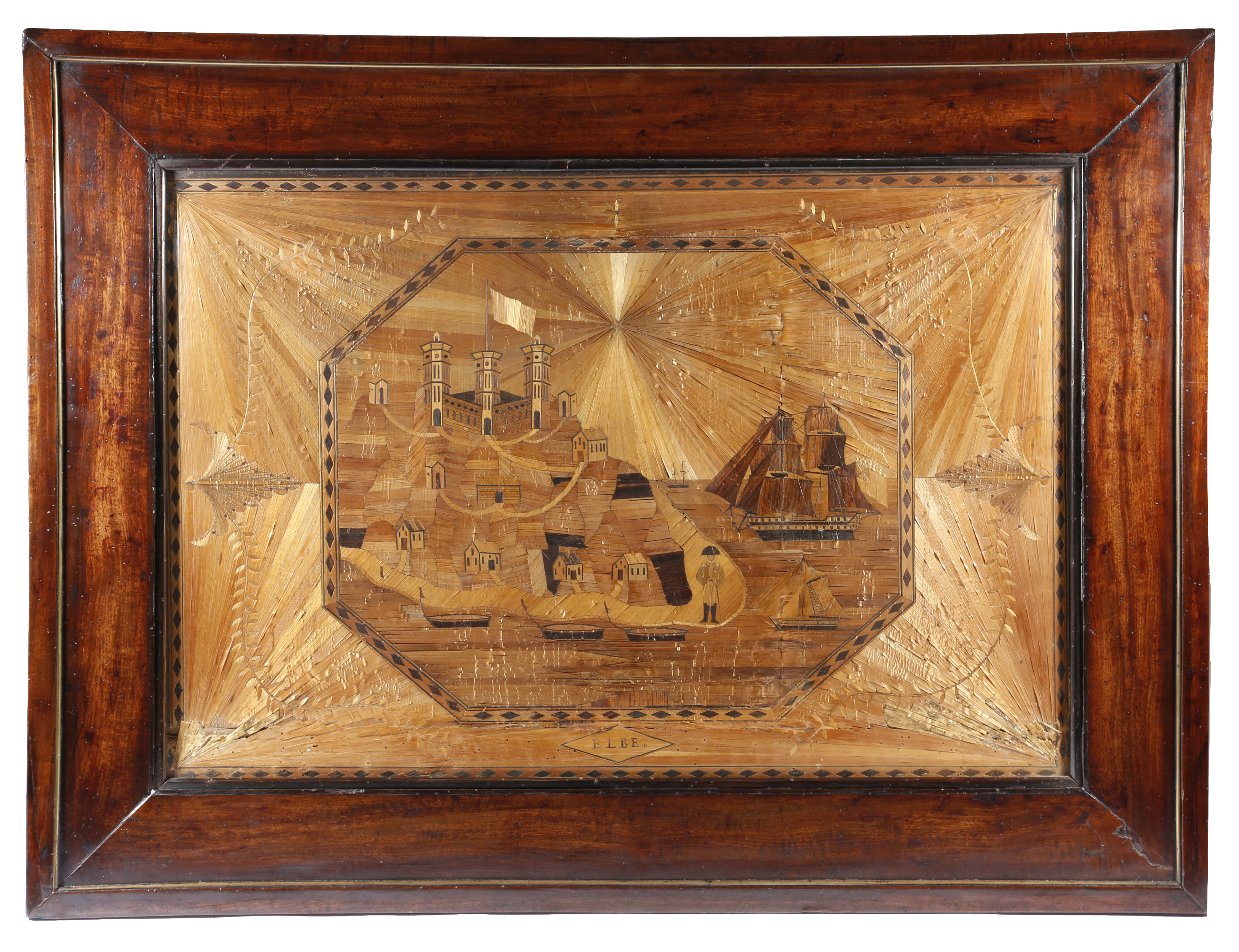 An early 19th century French prisoner of war straw-work picture, depicting Napoleon on the Island of Elba, possibly escaping, the sea with various ships and boats, including the British frigate 'Undaunted', with lozenge banding and leaf decoration, titled 'ELBE', 46.9 x 69.4cm, in a brass mounted walnut glazed frame.