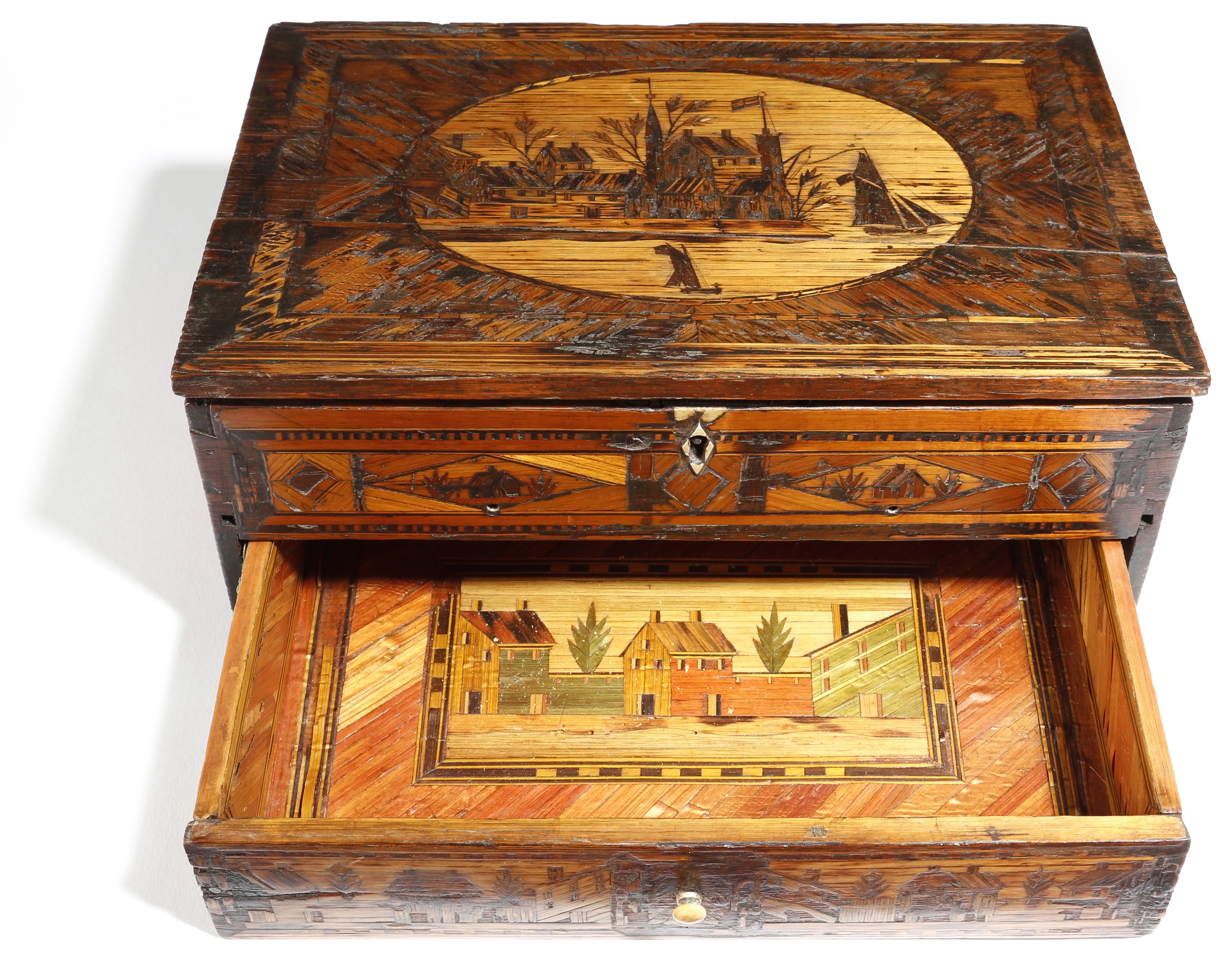 A Napoleonic prisoner of war straw-work games box, the hinged lid with an oval panel, inlaid with a harbour scene with buildings and boats, the body with further panels of buildings, the interior with a village street scene and a pair of lids, revealing four divisions for playing cards, with a base drawer with a bone handle, 11.3cm high, 25.9cm wide, 18.3cm deep.