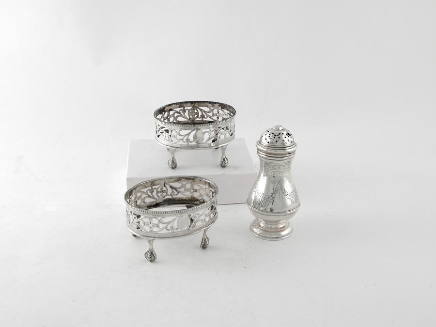 A pair of George III pierced oval salts, on ball and claw feet with bead borders (no liners), by Robert Hennell, London 1777, together with a George II bun top pepper of baluster form with later engraving, London 1737, the latter 4in (10cm) high, 5.5oz. (3)