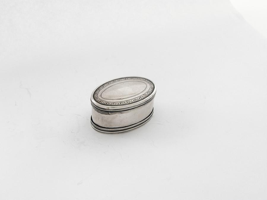 A George III oval nutmeg grater, with reeded borders, a hinged cover with border-engraving, a hinged base and a steel grater, by Hester Bateman, London 1795, 1.75in (4.5cm) long, 0.8oz.