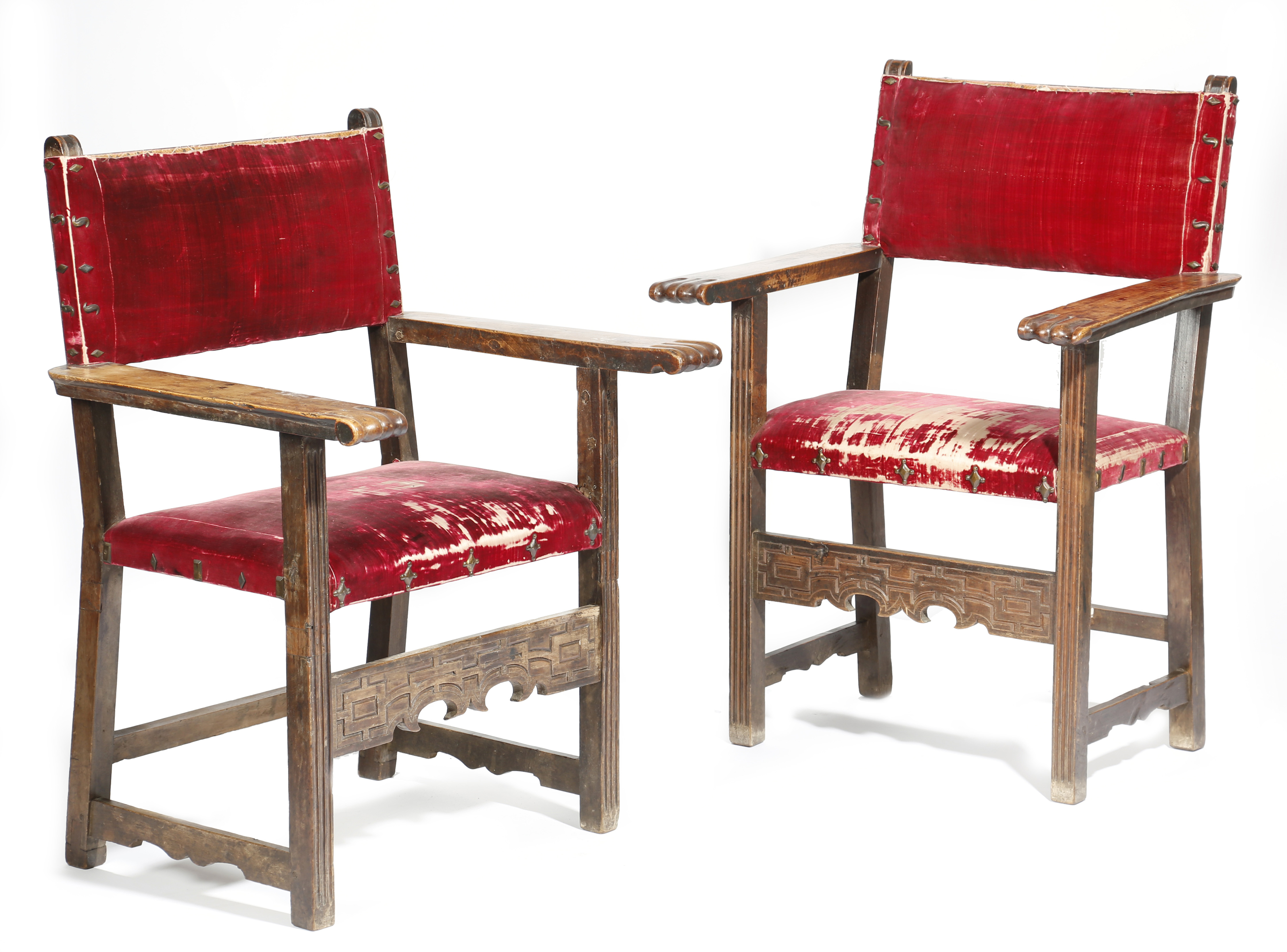 A pair of Italian walnut open armchairs in Renaissance style, each with a velvet padded back and seat, the front rail with relief carved decoration. (2)