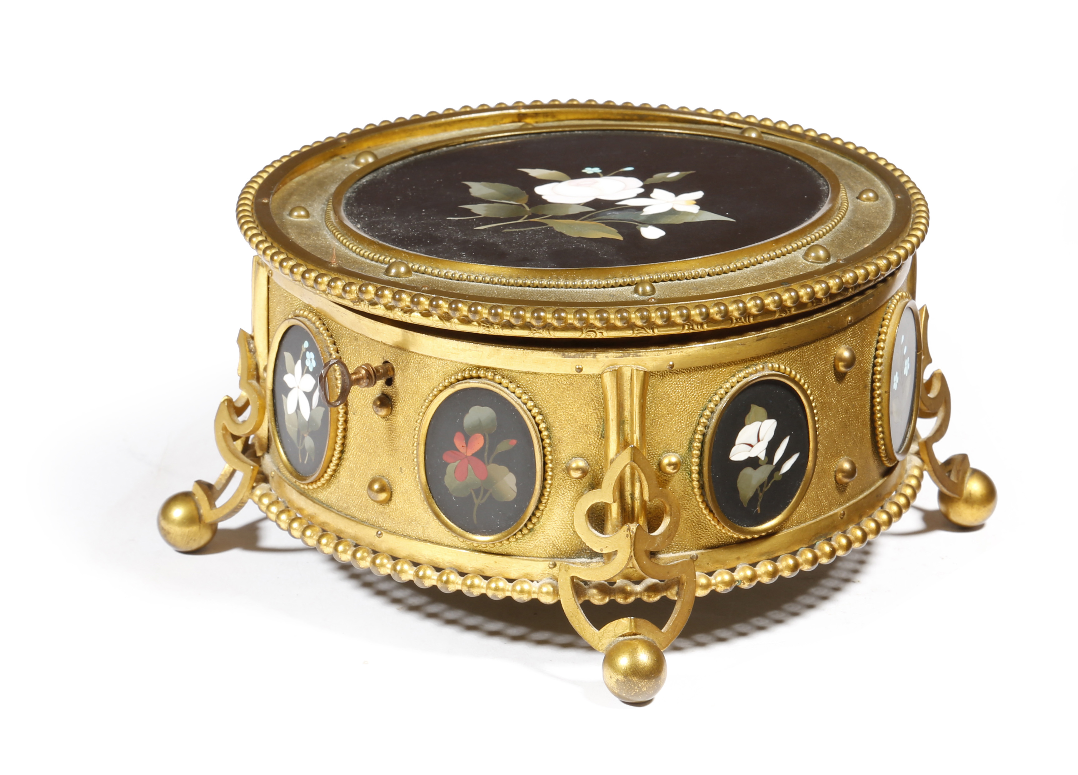 A late 19th century Italian Florentine gilt brass and pietra dura jewellery casket