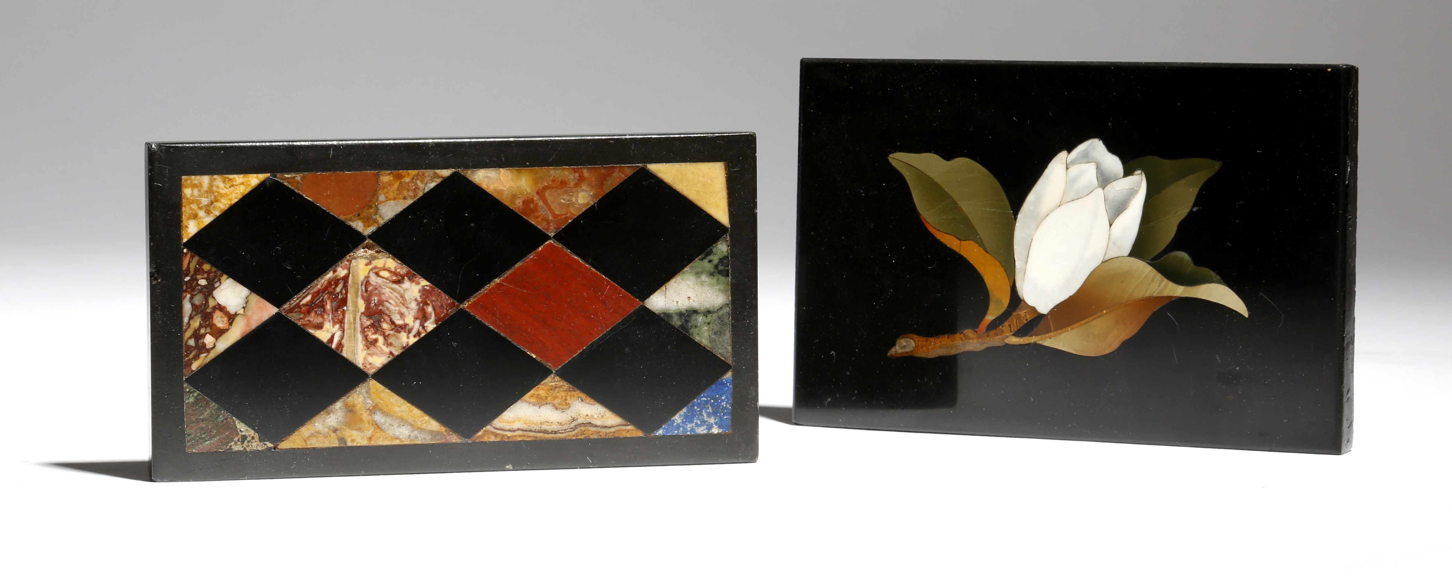 Two late 19th century Italian pietra dura paperweights, one inlaid with a flower, the other with specimen marbles in a geometric lozenge design, 12.3cm wide (max). (2)