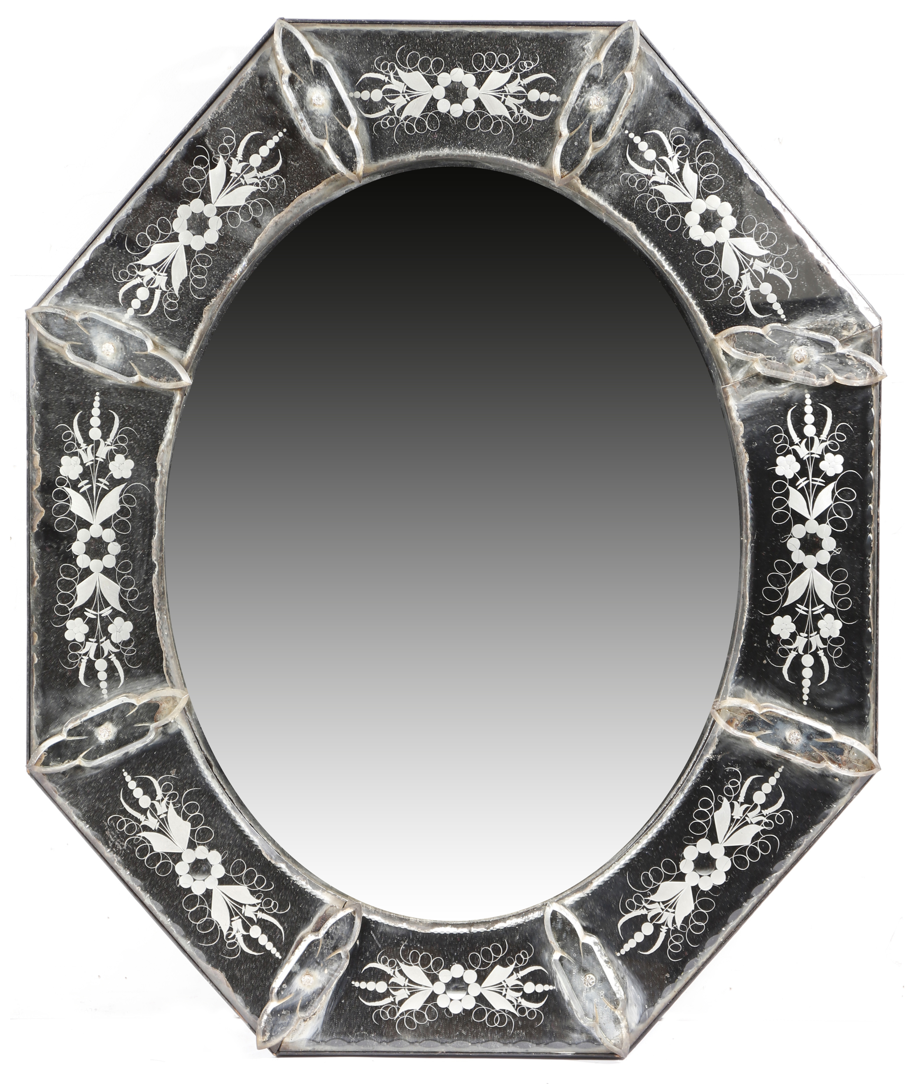 An Italian Venetian wall mirror, the oval plate within an octagonal etched frame, late 19th century, 86.9 x 71.9cm.