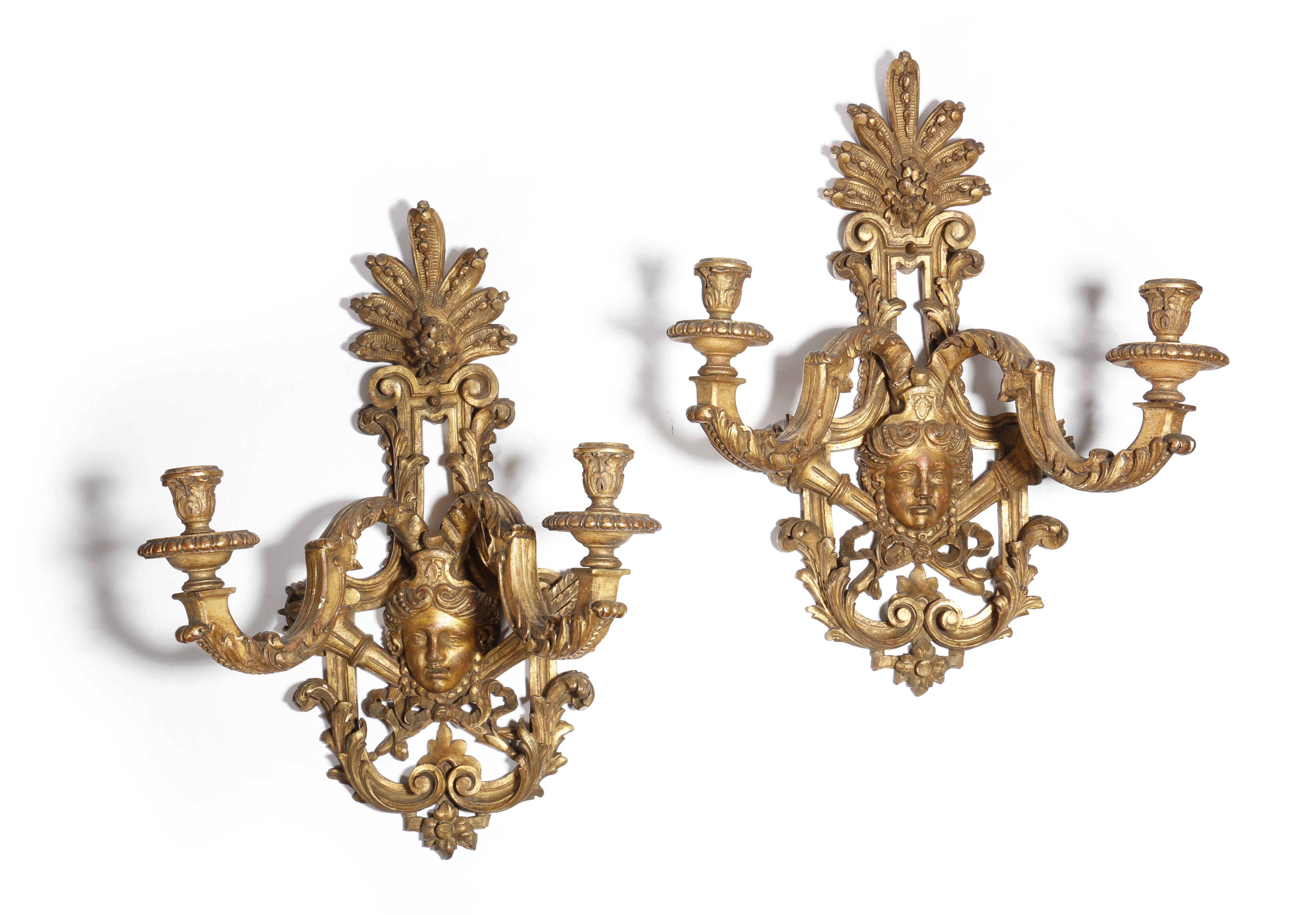 A pair of continental giltwood twin-light wall appliques in Regence style