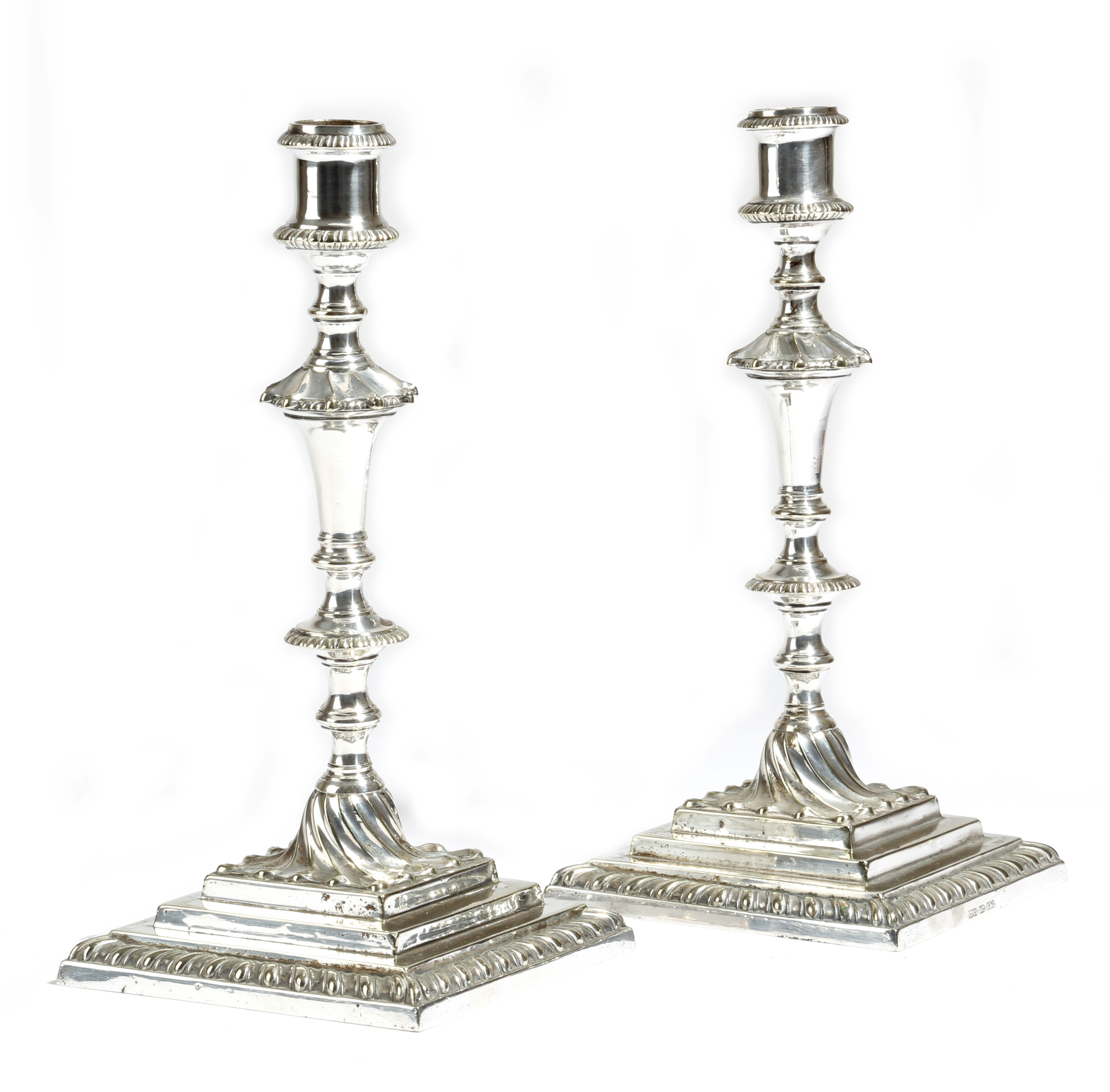 A pair of George III style candlesticks, with a turned nozzle above a batswing knop and a conforming base and a stepped plinth, stamped 'MAPPIN WEBB' '&CO' 'S&L', possibly Paktong or silver plated, 25.2cm high. (2)