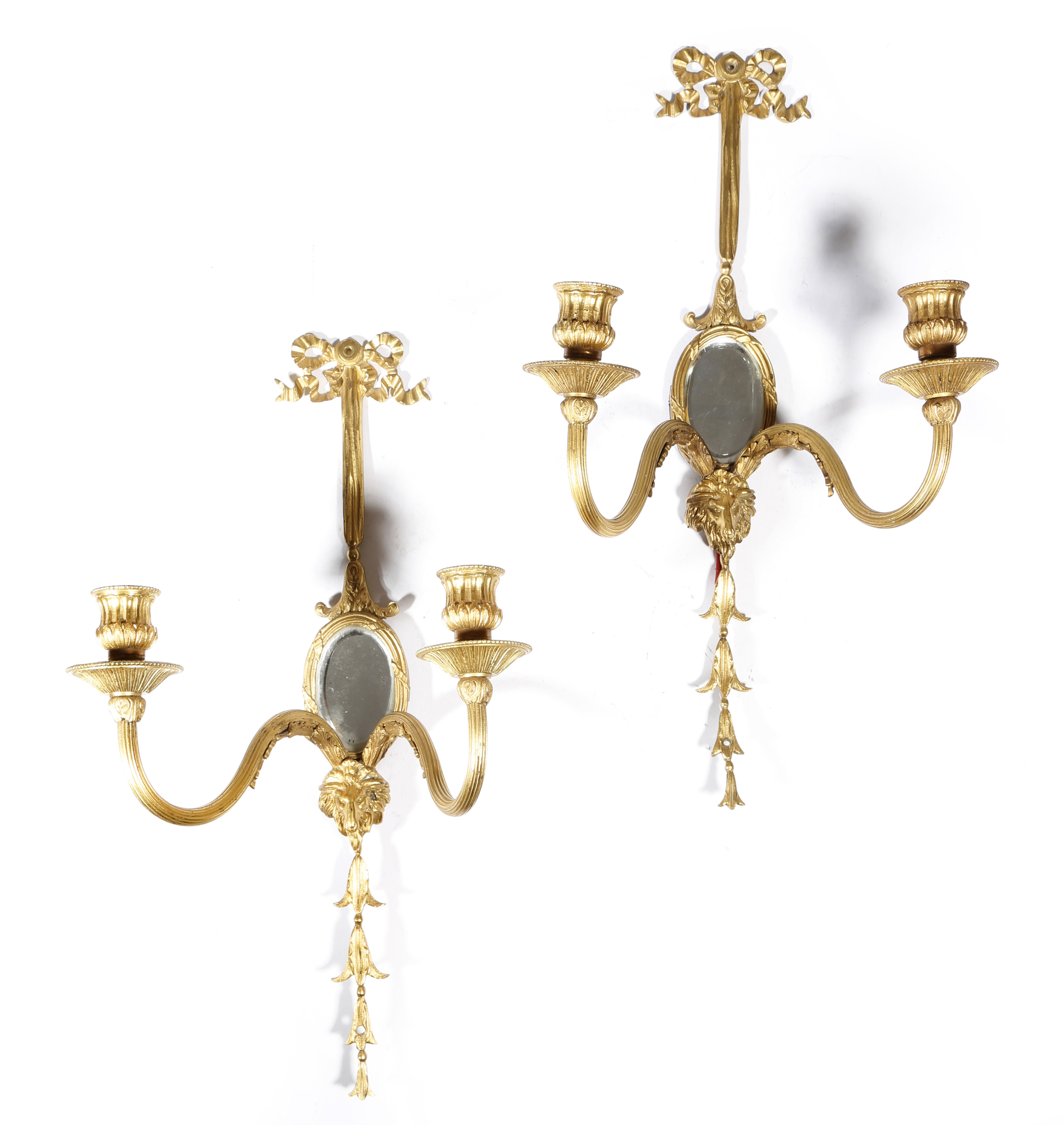 A pair of French ormolu twin-light wall appliques in Louis XVI style, each with a ribbon tied drape and husk back plate, inset with a bevelled oval mirror and with a ram's mask, with reeded leaf scrolling branches and fluted nozzles, the back stamped '75WS', late 19th century, 44cm high, 24cm wide. (2)