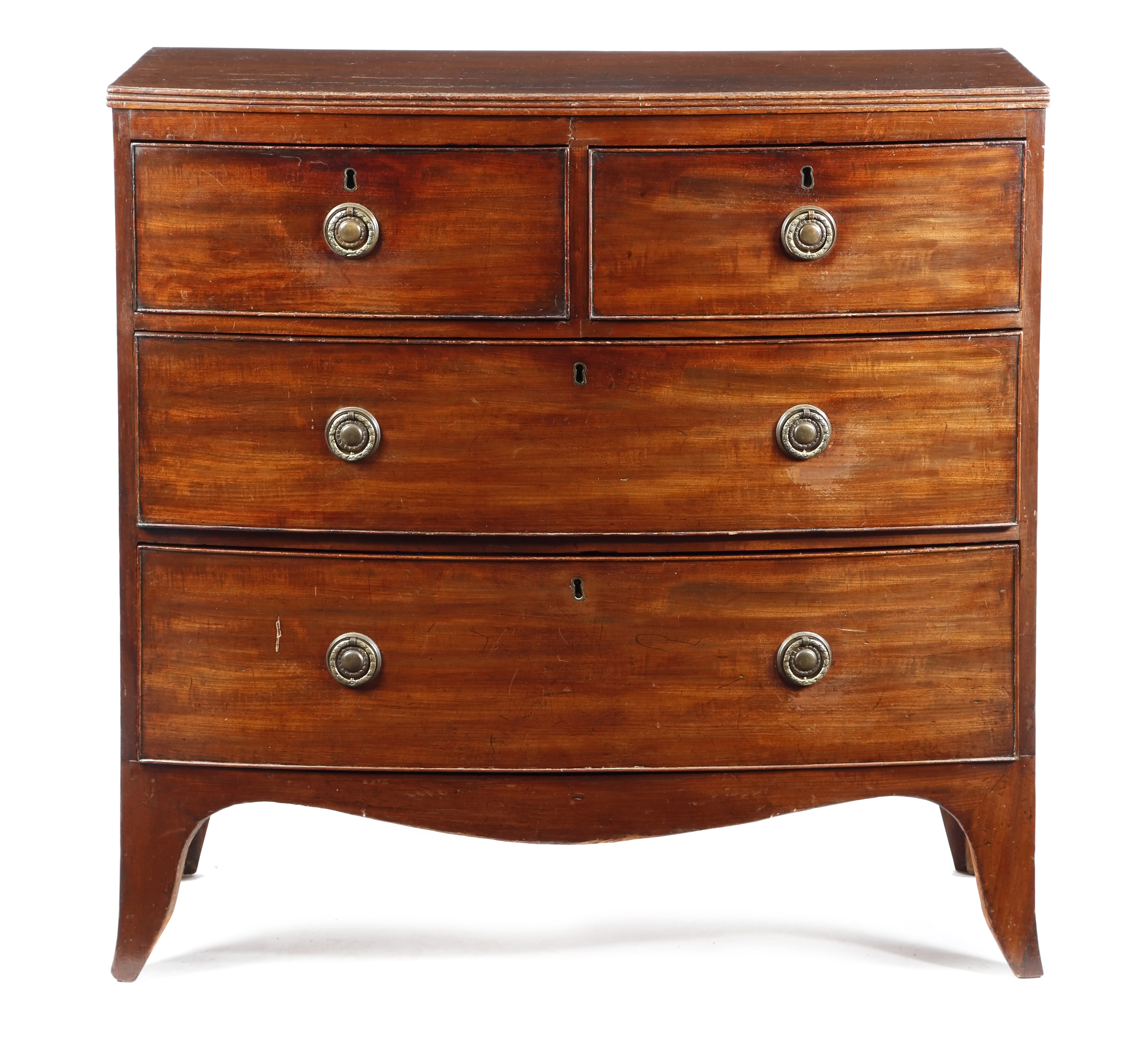 A Regency mahogany bowfront chest, the top with a reeded edge above two short and two long drawers and on French bracket feet, 87.7cm high, 89.1cm wide, 46.5cm deep.