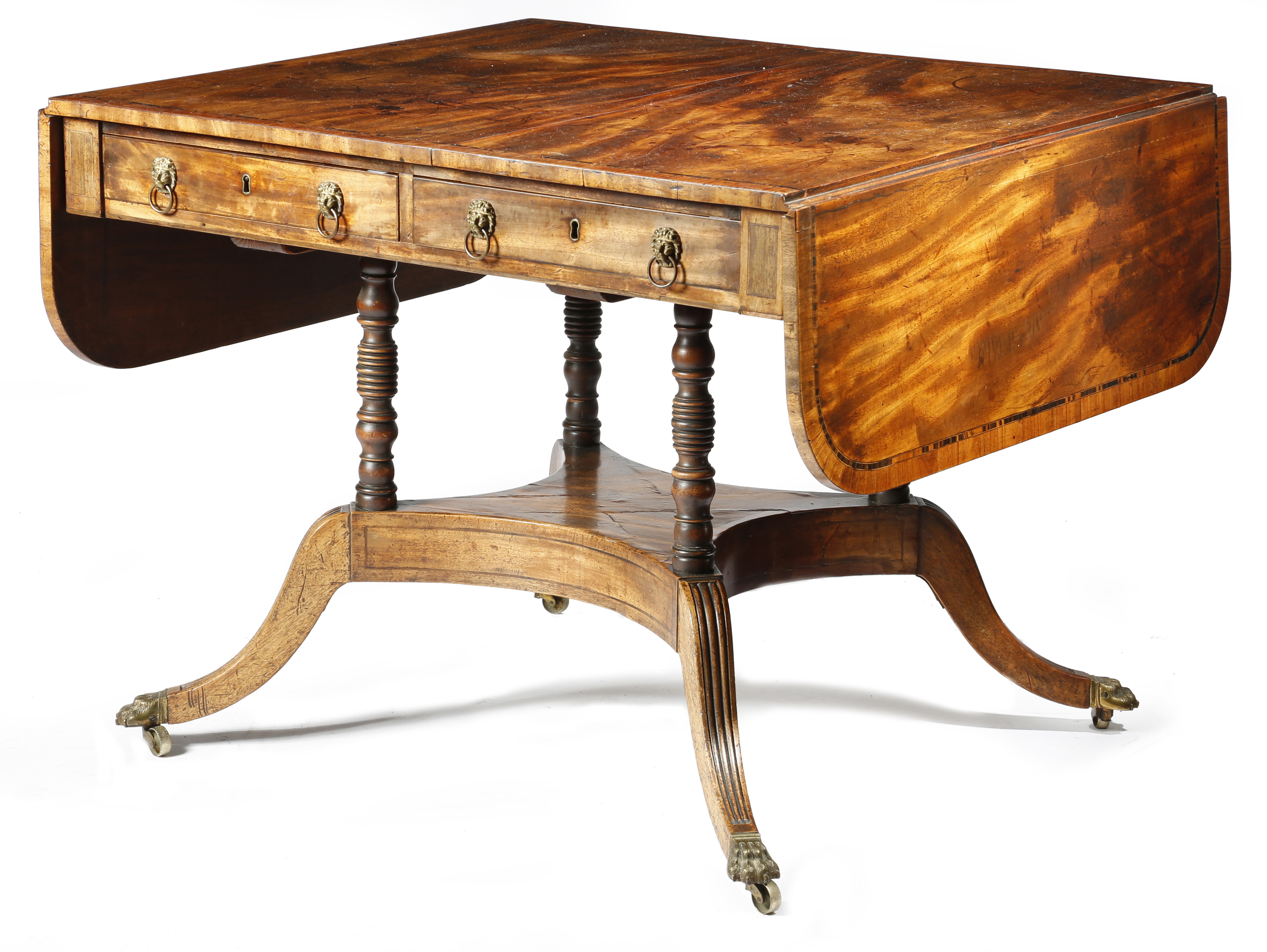 A Regency mahogany sofa table, the drop-flap top banded with kingwood and calamander, above a pair of frieze drawers with false fronts on reverse, on four turned column supports and brass lion's paw sabot and castors, 74.8cm high, 86.2 x 154.7cm (open).
