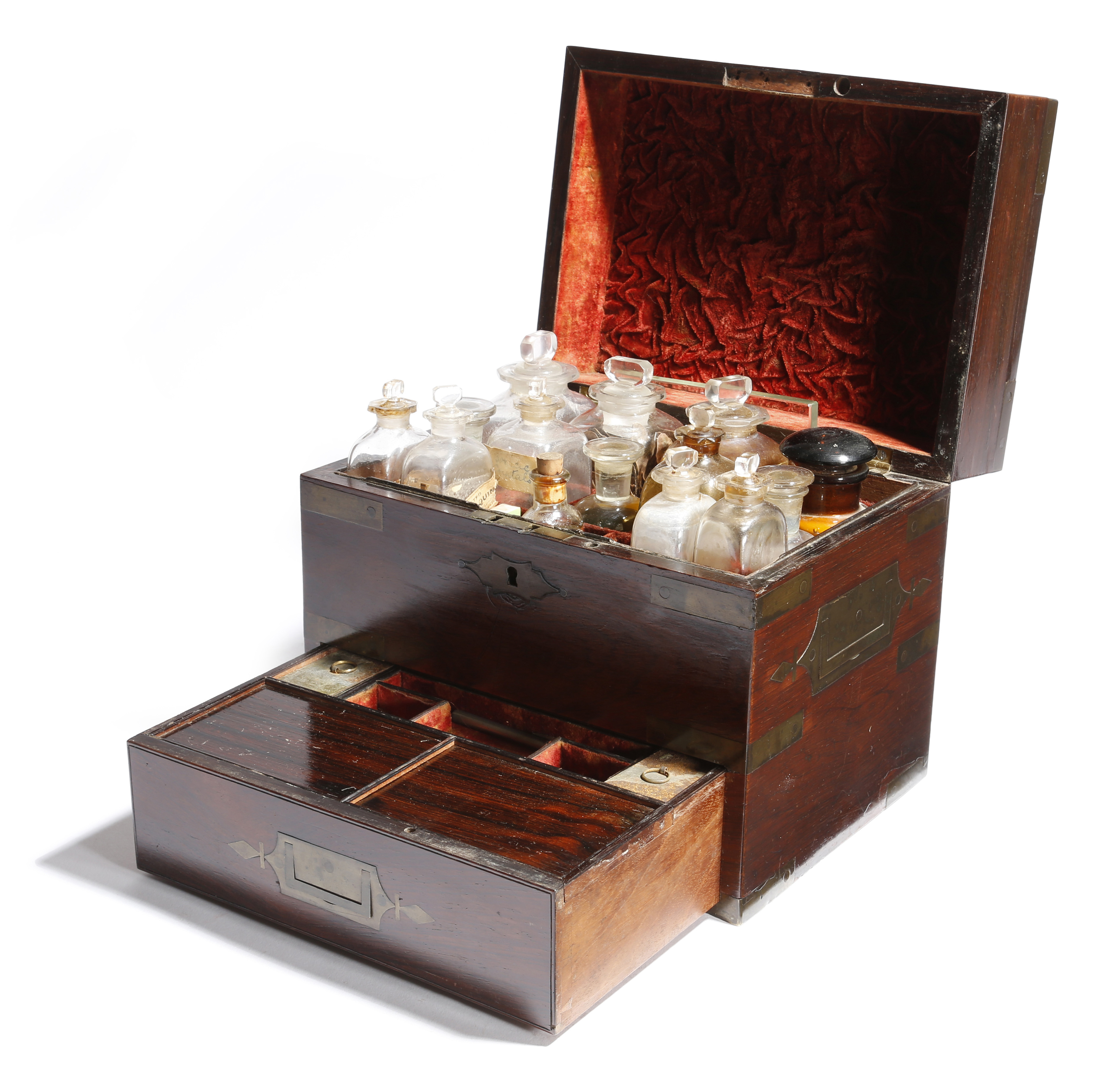 λ An early Victorian rosewood and brass mounted apothecary's box, the hinged lid with a vacant plaque, revealing a divided interior, fitted with various glass jars and stoppers and a glass stand, with a base drawer fitted with further bottles, a pair of metal lidded compartments and of divided compartments with sliding cover, fitted with a mortar and pestle and other items, with sunken brass military style handles, 23.5cm high, 26.7cm wide, 19.5cm deep.