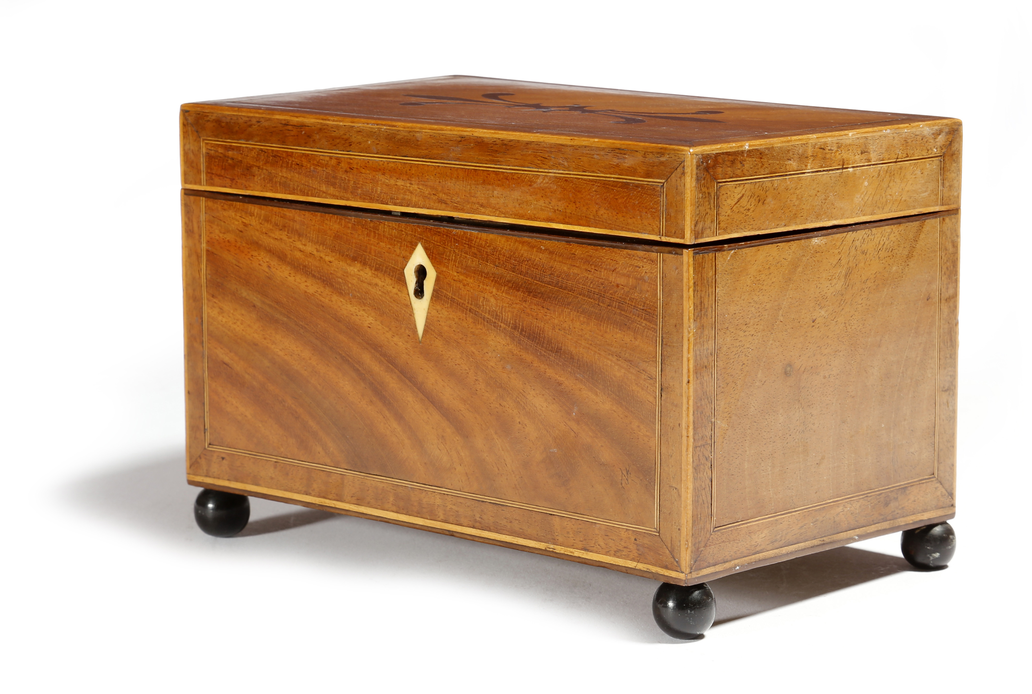 A late George III mahogany tea caddy, inlaid with stringing, the hinged crossbanded top decorated with ebonised fleur de lis, with a pair of lidded compartments, with bone handles, on ebonised bun feet, 12.9cm high, 19.4cm wide.
