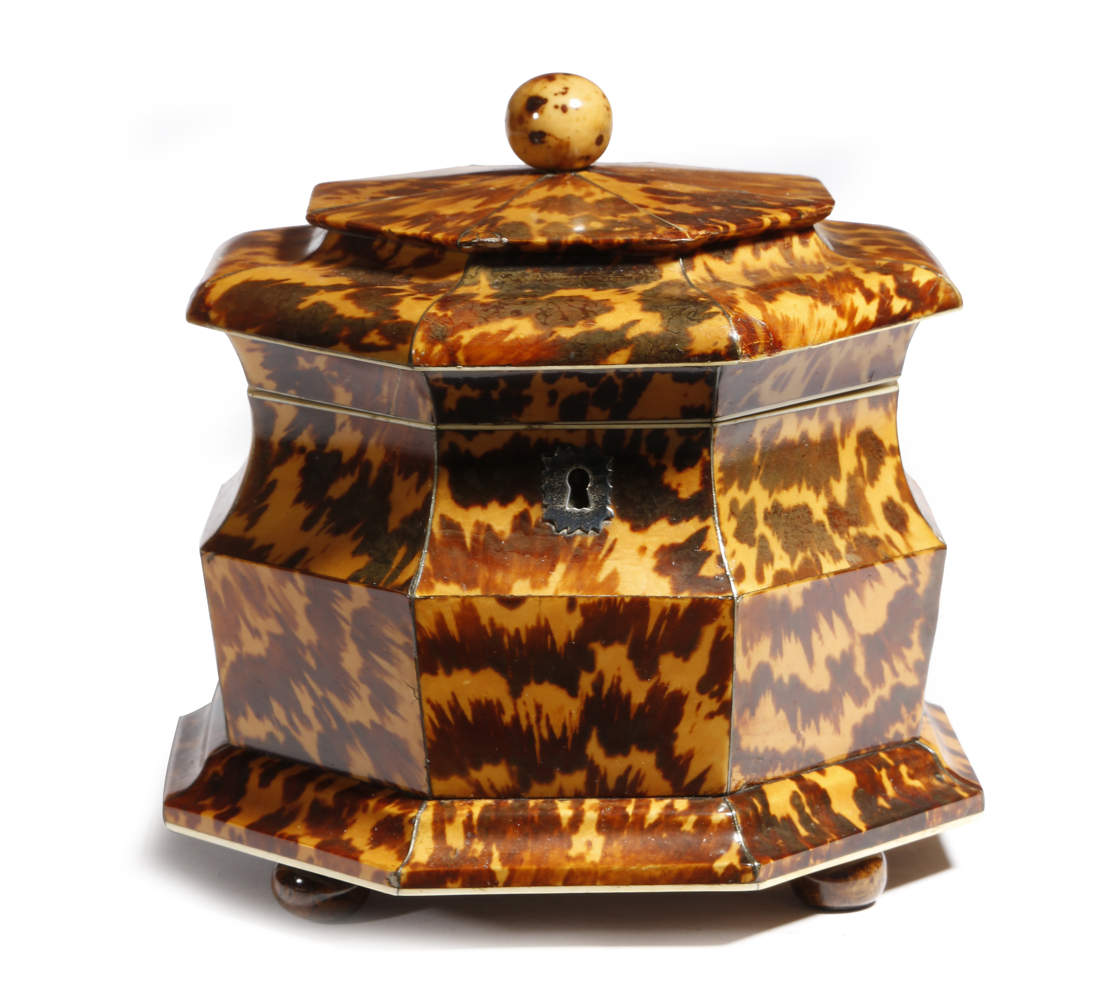 λ An early 19th century tortoiseshell tea caddy, of octagonal bombe shape, inlaid with pewter stringing, the hinged lid with a ball handle revealing a twin lidded interior with ivory edging, with a silver escutcheon and on ball feet, 17cm high, 18cm wide.