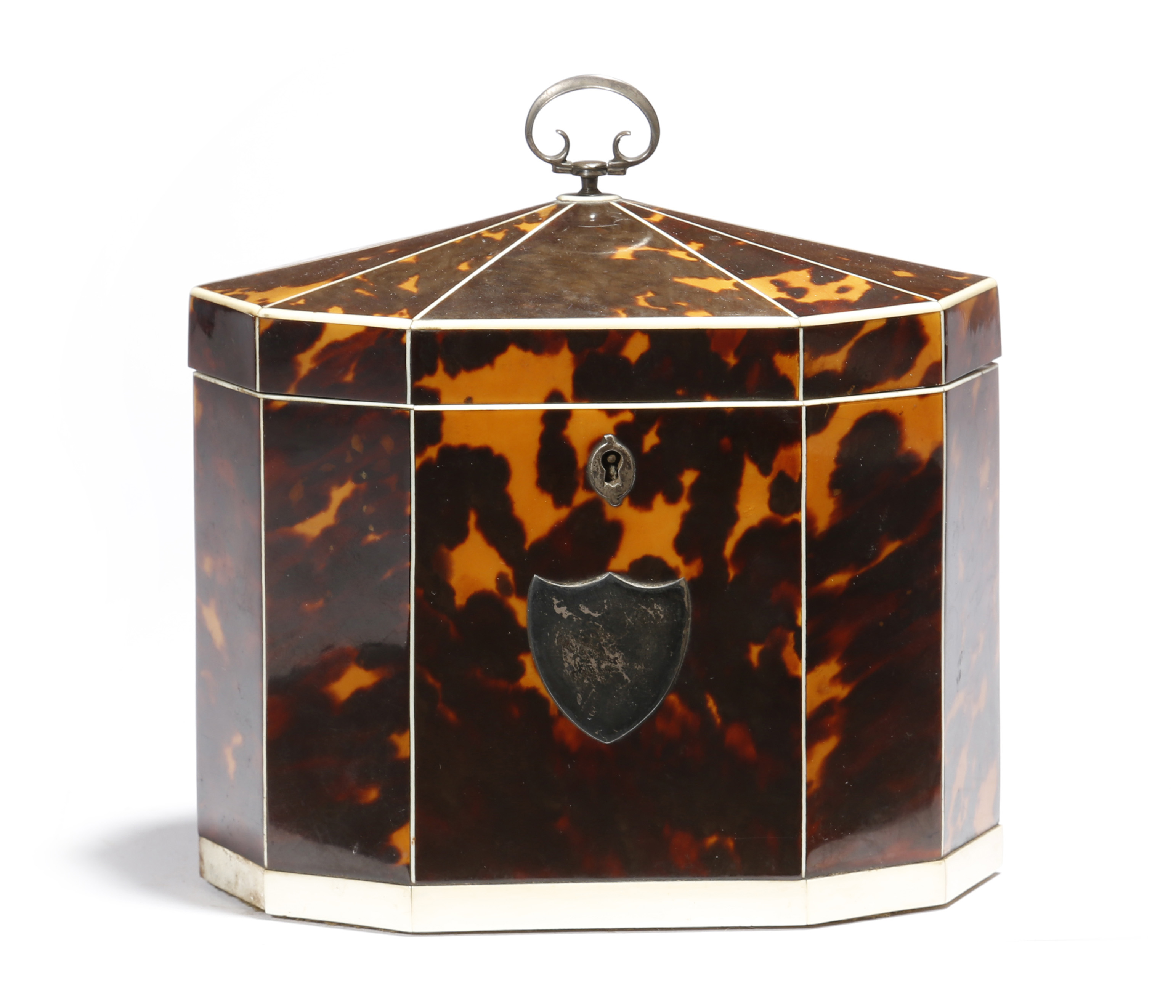 λ A George III tortoiseshell and ivory tea caddy, with a silver handle, escutcheon and shield shape plaque, the hinged tent top revealing a divided interior with lids, 14.1cm high, 15.5cm wide, 8.7cm deep.