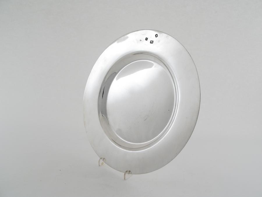 A modern plain circular dinner plate, with a broad flange, maker "CE", possibly Charles Edwards, London 1945, 10.25in (26cm) diameter, 20oz.