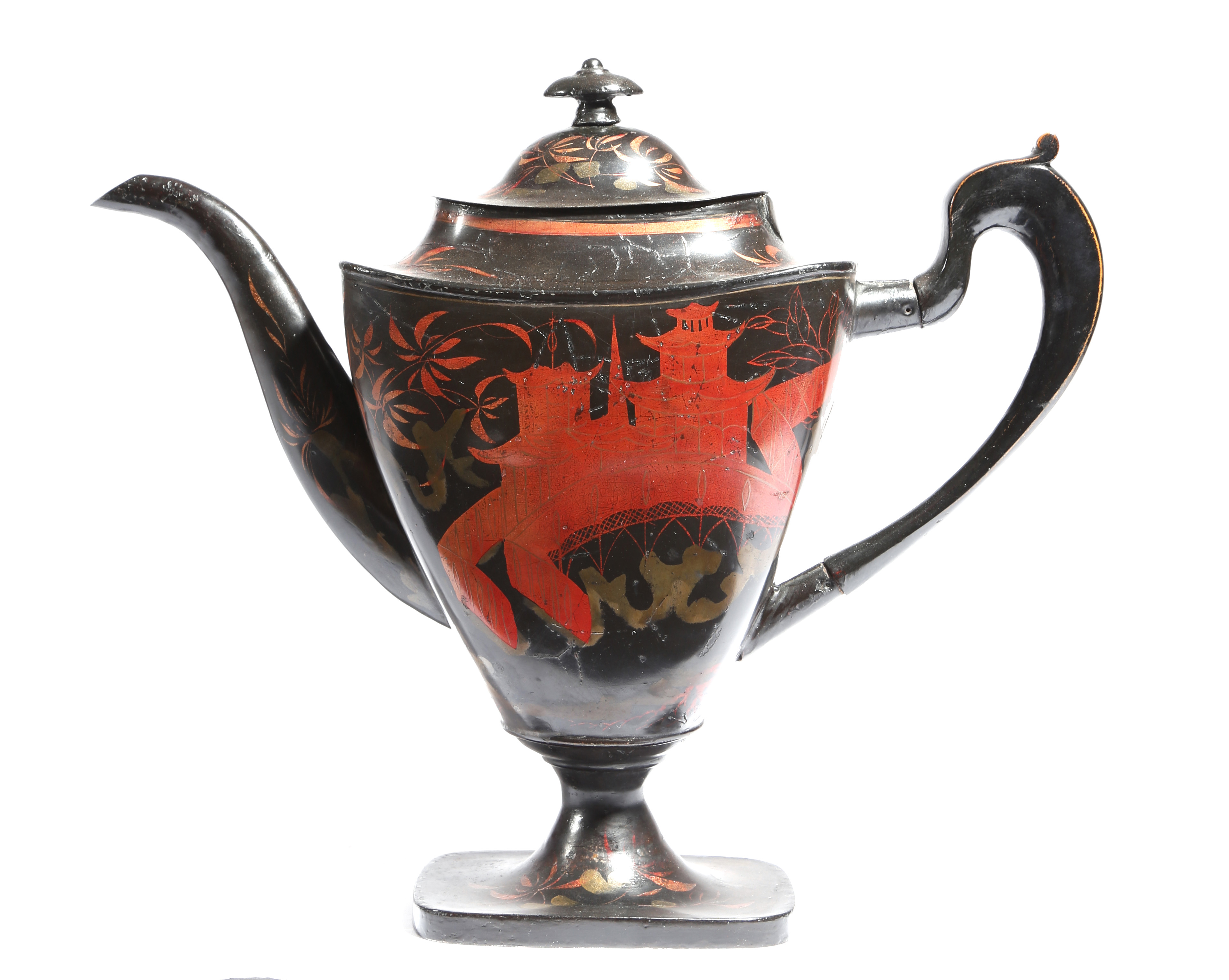 A George III Welsh Pontypool japanned tole coffee pot, chinoiserie decorated with pagodas, the domed hinged lid above an urn shaped body and a wooden scroll handle, 27.5cm high.