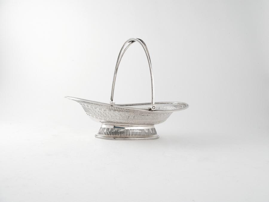 A modern, pierced oval basket, with a swing handle, bead borders and a pierced foot, by Goldsmiths & Silversmiths Co Ltd, London 1918, 12.8in (32.5cm) wide, 24oz.