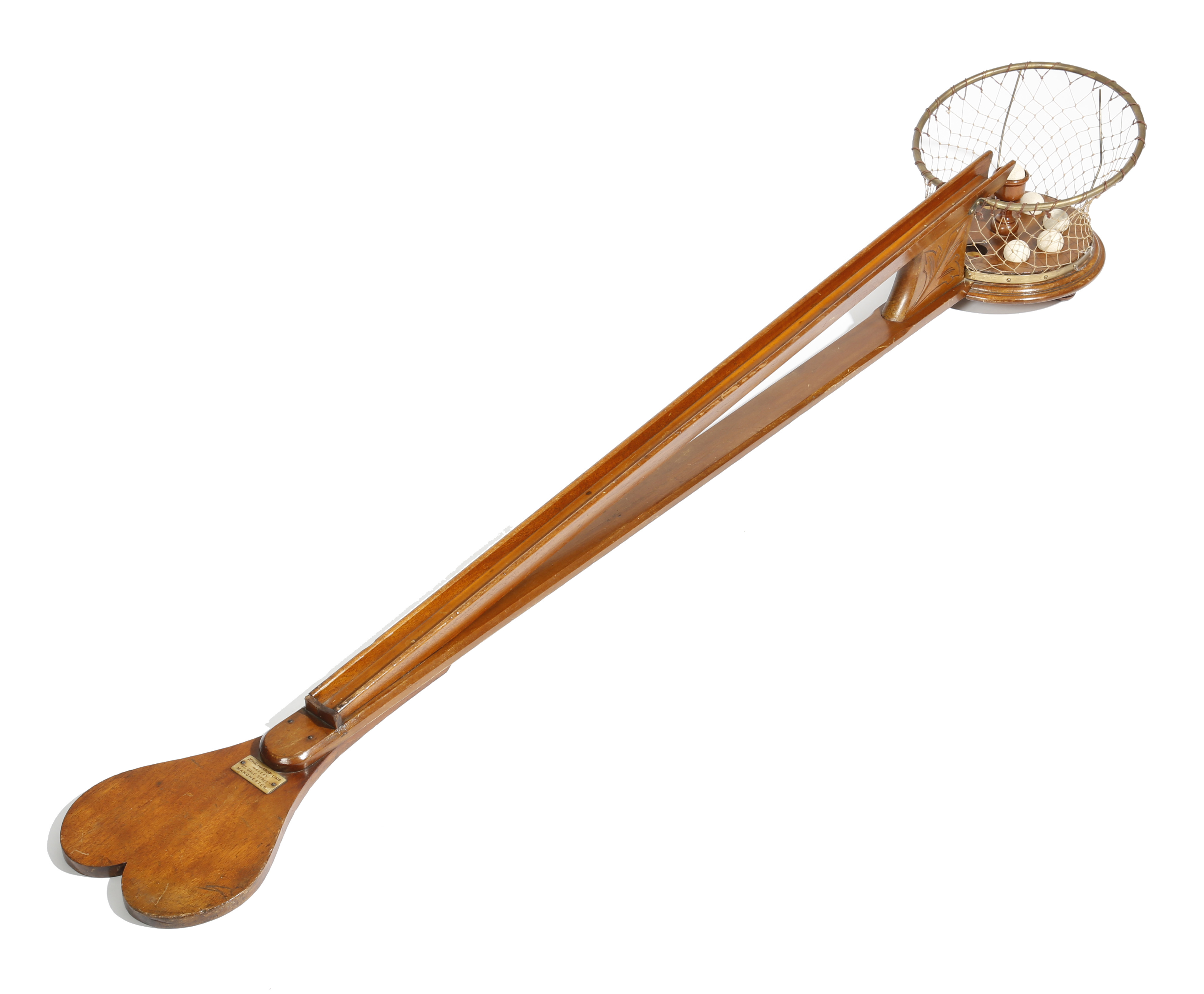 A late Victorian walnut and brass mounted ball game by John Harrop, with a string net to one end with nine apertures, one in the form of an egg cup, with an ivorine label inscribed 'JOHN HARROP LIMD, MAKERS, 27, DALE STREET, MANCHESTER', with five balls, 174cm long.