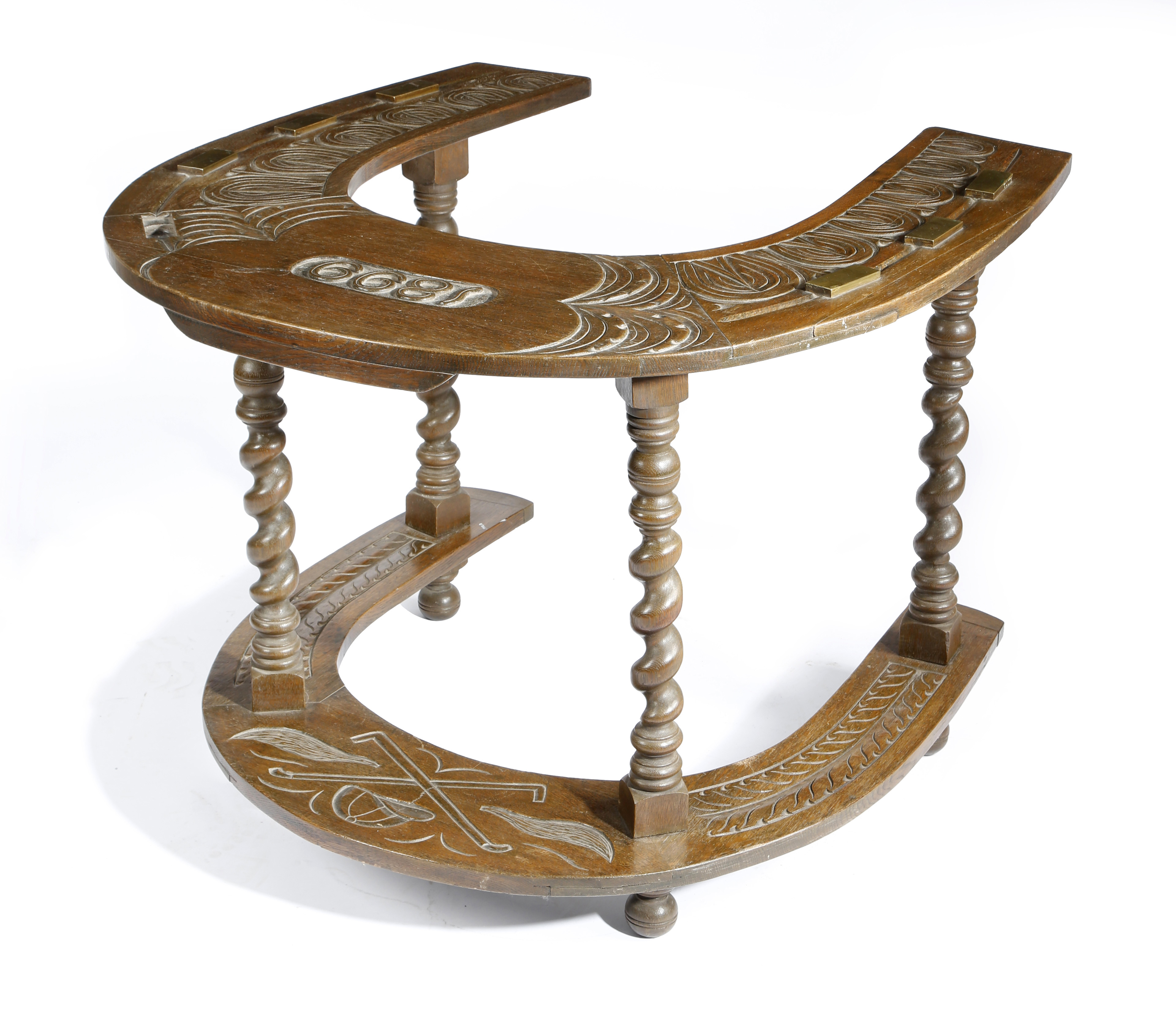 A late Victorian oak bookmaker's rostrum, of horseshoe shape, carved with leaves and a jockey's cap and crossed riding whips with the date '1899', with brass mounts and an aperture for an inkwell, 73.8cm high, 96.5cm wide, 97cm deep.