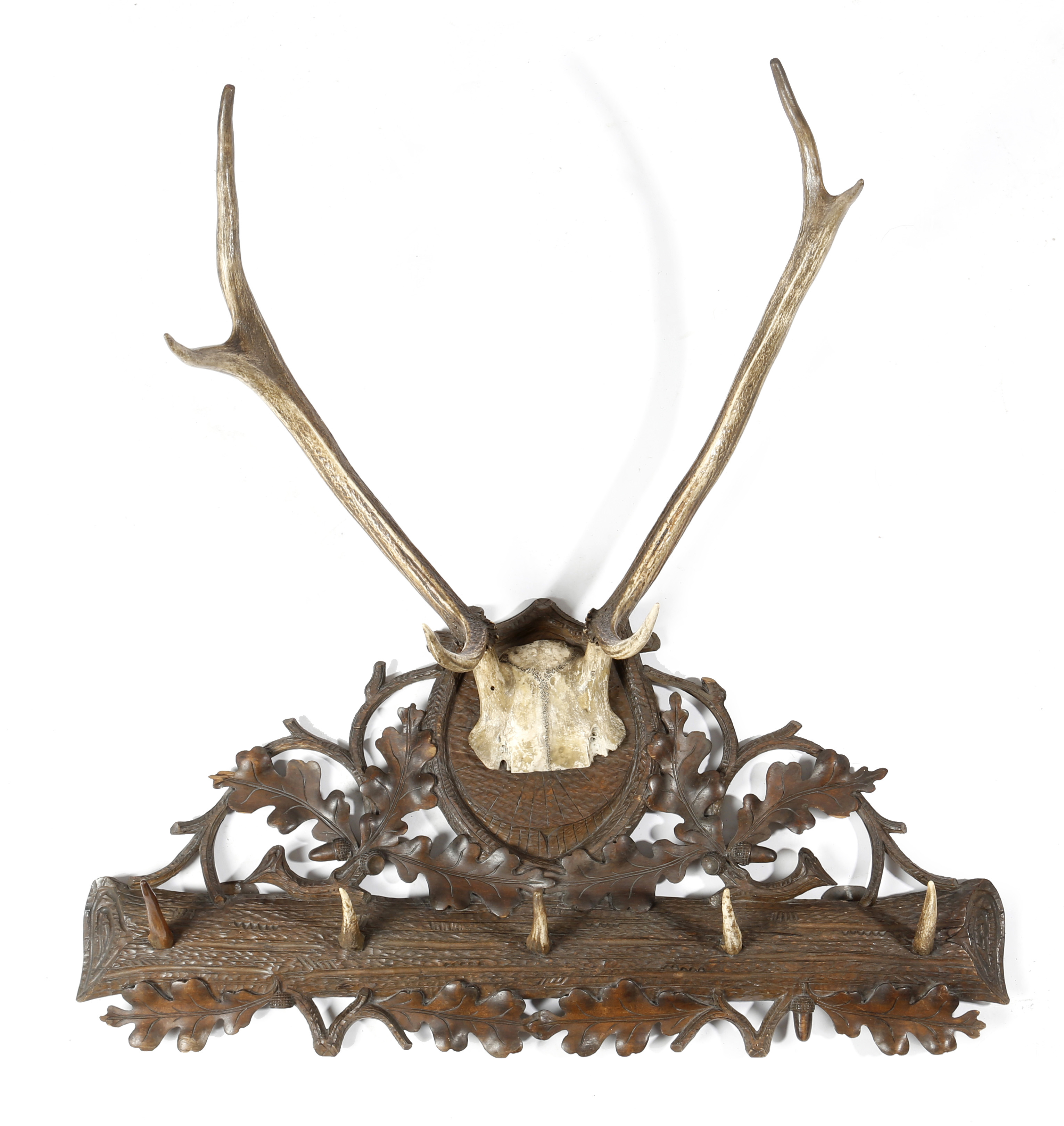 A late 19th century Black Forest carved wood and antler coat and hat rack, carved with oak leaves and acorns, mounted with six-point antlers, with a wooden log base applied with five antler hooks, 71.8cm high, 70.7cm wide.