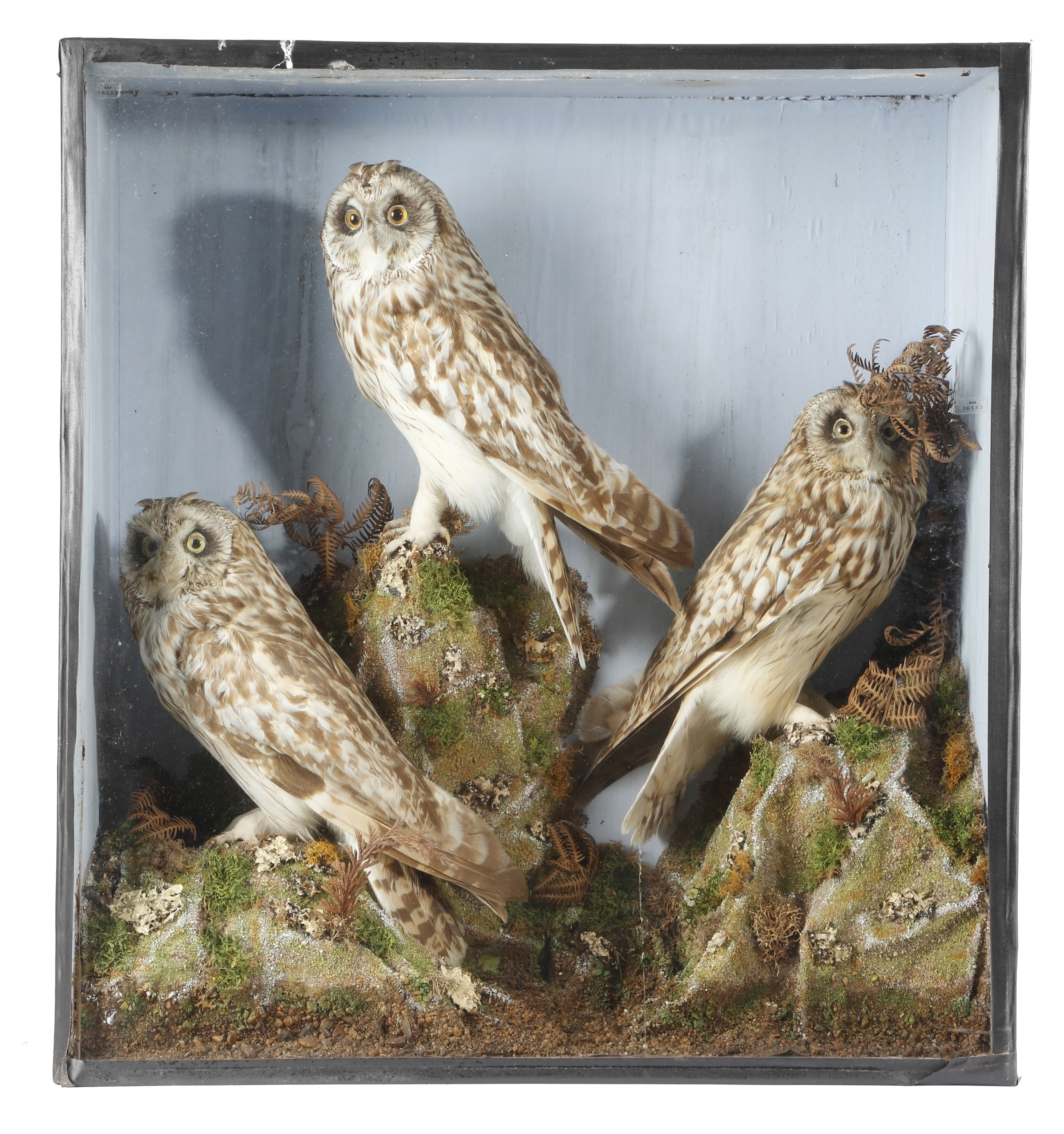 Taxidermy. A late Victorian preserved group of three short eared owls by R. P. Nichols of Kingsbridge, mounted in a naturalistic setting, in an ebonised and glazed case, the back with a printed paper label, inscribed 'R. P. NICHOLS, Hatter and Taxidermist, FORE ST., KINGSBRIDGE, DEVON', 66.8cm high, 61.2cm wide, 23.2cm deep.