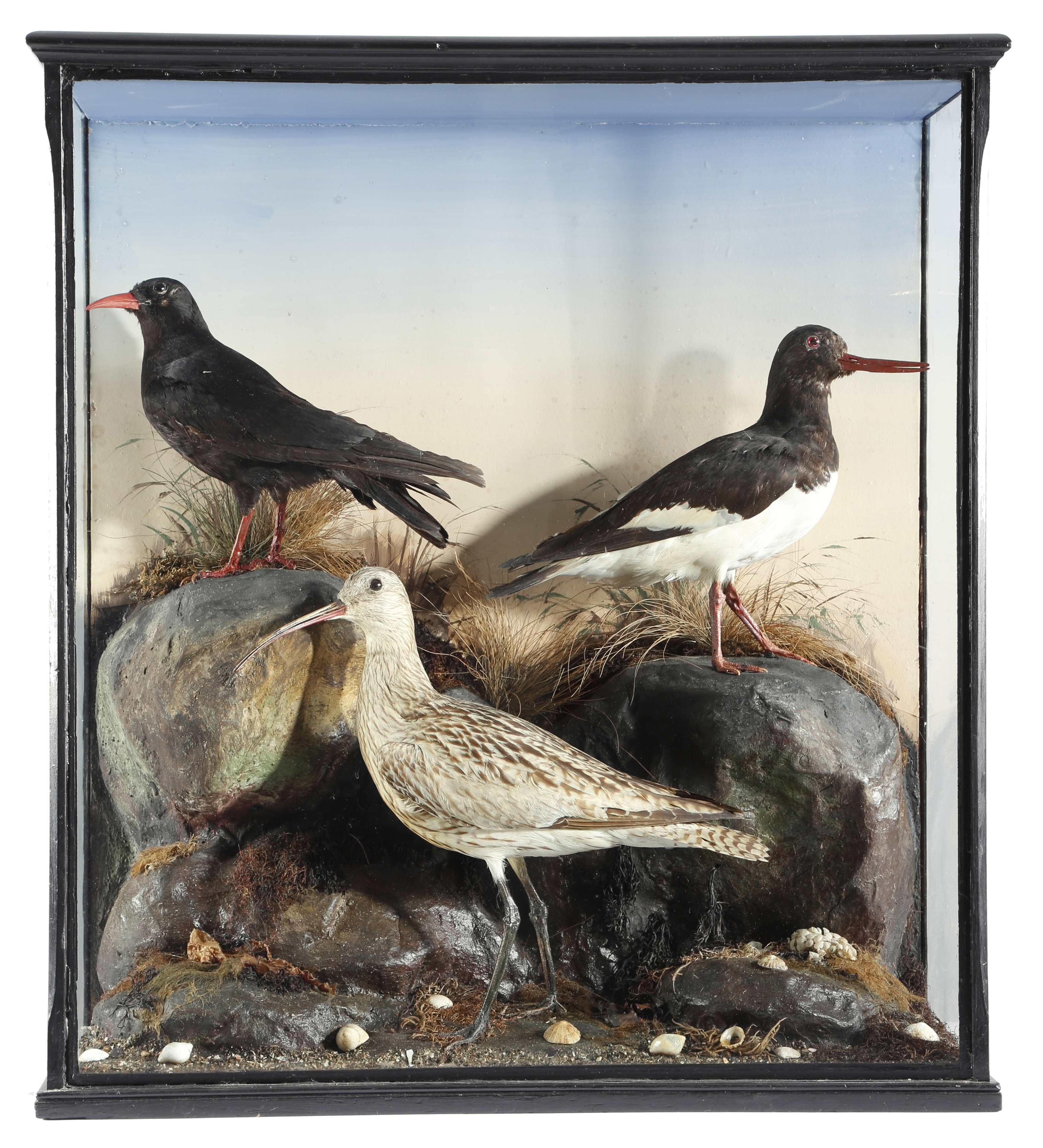 Taxidermy. An Edwardian preserved group of three birds attributed to William Macleay of Inverness, comprising: a Cornish chough, an oyster catcher and a curlew, mounted in a naturalistic setting with rocks and shells and with a painted backboard, in an ebonised and glazed case, 78cm high, 70.5cm wide, 26.7cm deep.
