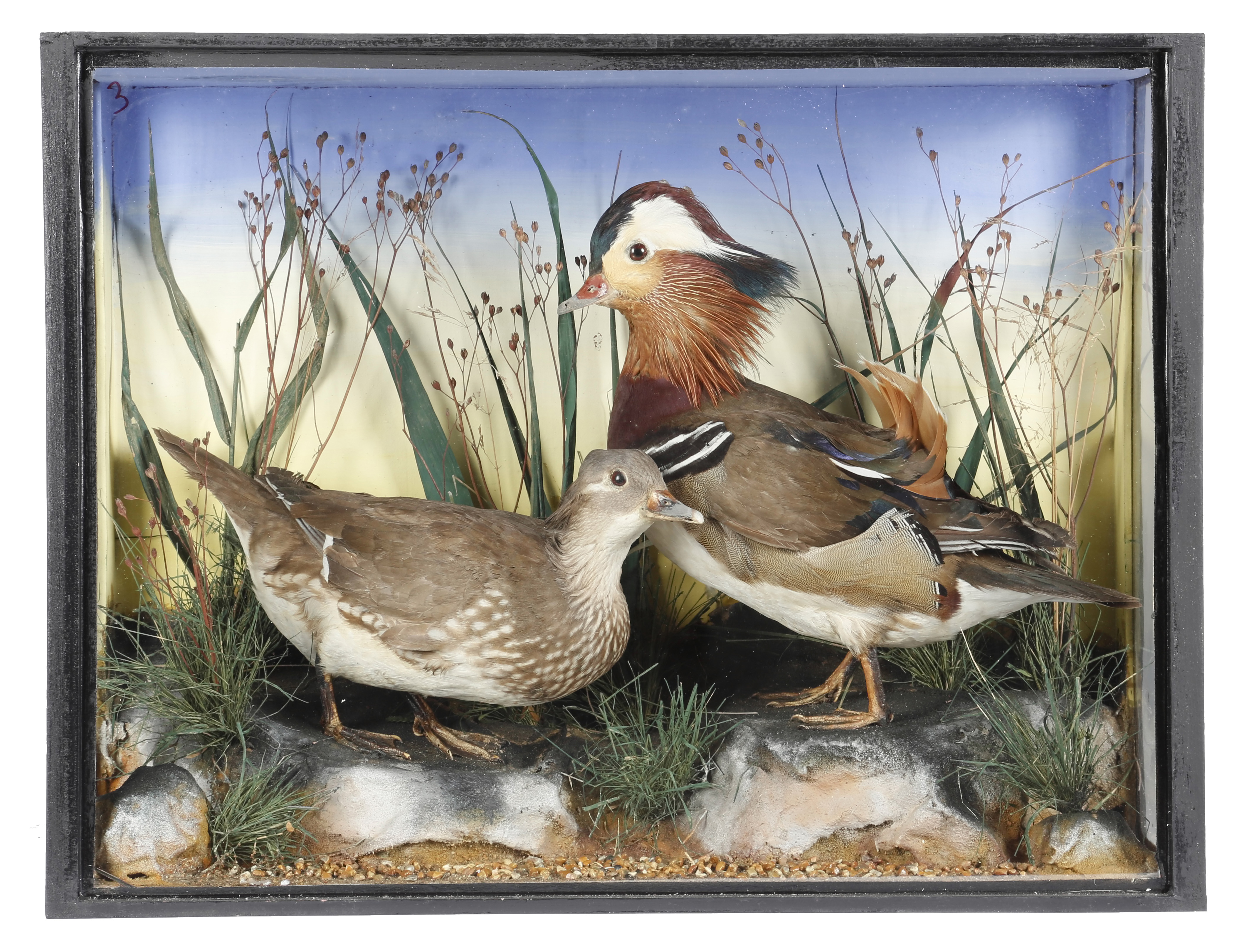 Taxidermy. An early 20th century preserved group of a pair of mandarin ducks by Edward Fortnum of Leighton Buzzard, mounted in a naturalistic setting, with a graduated painted backboard, in an ebonised glazed case, the back with a printed paper trade label, inscribed 'EDWD FORTNUM Bird, Fish and Animal Stuffer, Picture Frame Maker etc., for North Street, Leighton Buzzard...', 45.1cm high, 58.7cm wide, 23.5cm deep.