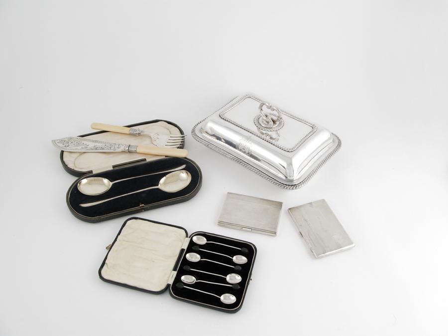 A mixed lot: a cased pair of serving spoons, a case containing six bean-end coffee spoons, two cigarette cases, a plated entree dish and cover with detachable handle and a pair of plated fish servers with ivory handles. (7)