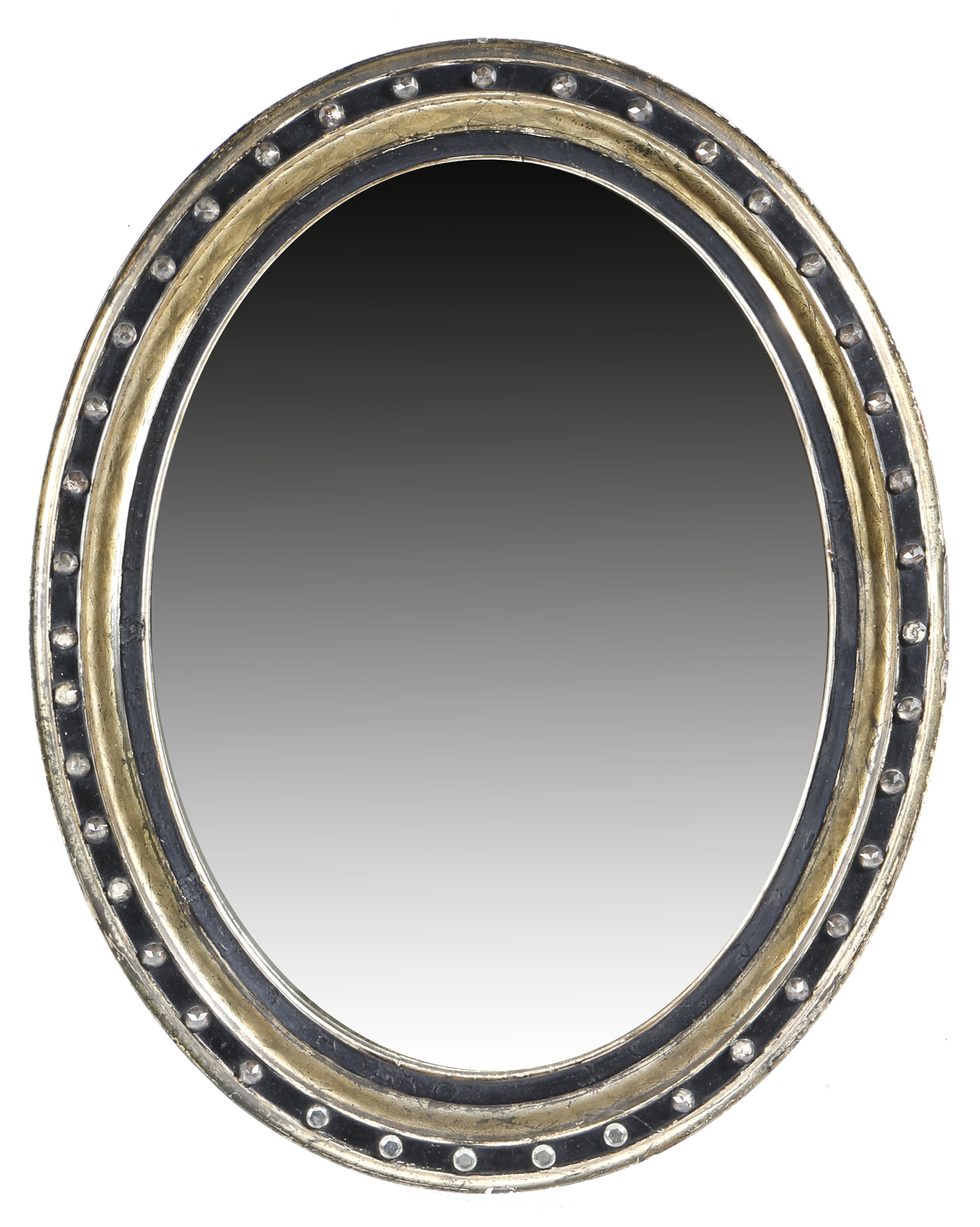 A 19th century Irish ebonised and gilt oval wall mirror, the moulded frame inset with faceted glass cabochons, 74.7 x 59cm.