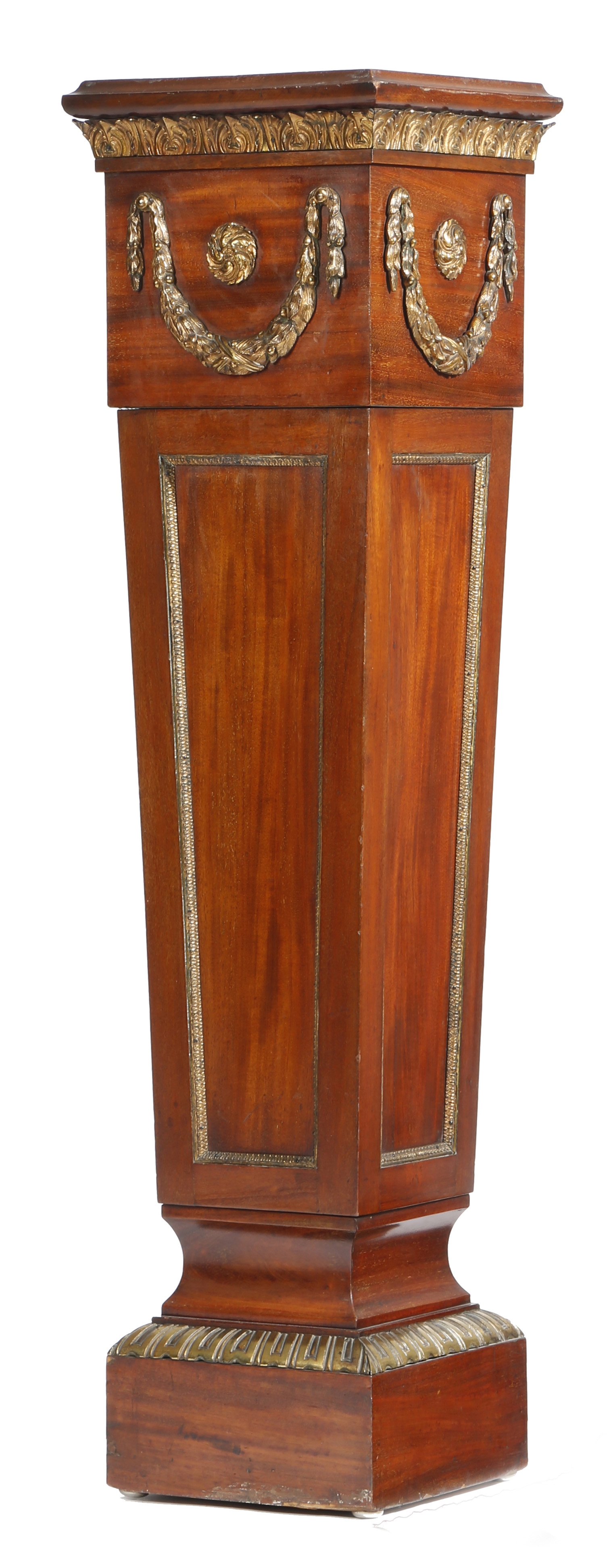 A late Victorian mahogany and brass mounted Neo-classical style pedestal, the top with a moulded edge, above a leaf frieze and swags of acanthus and swirling flower heads, 106.4cm high, 27.8cm wide.