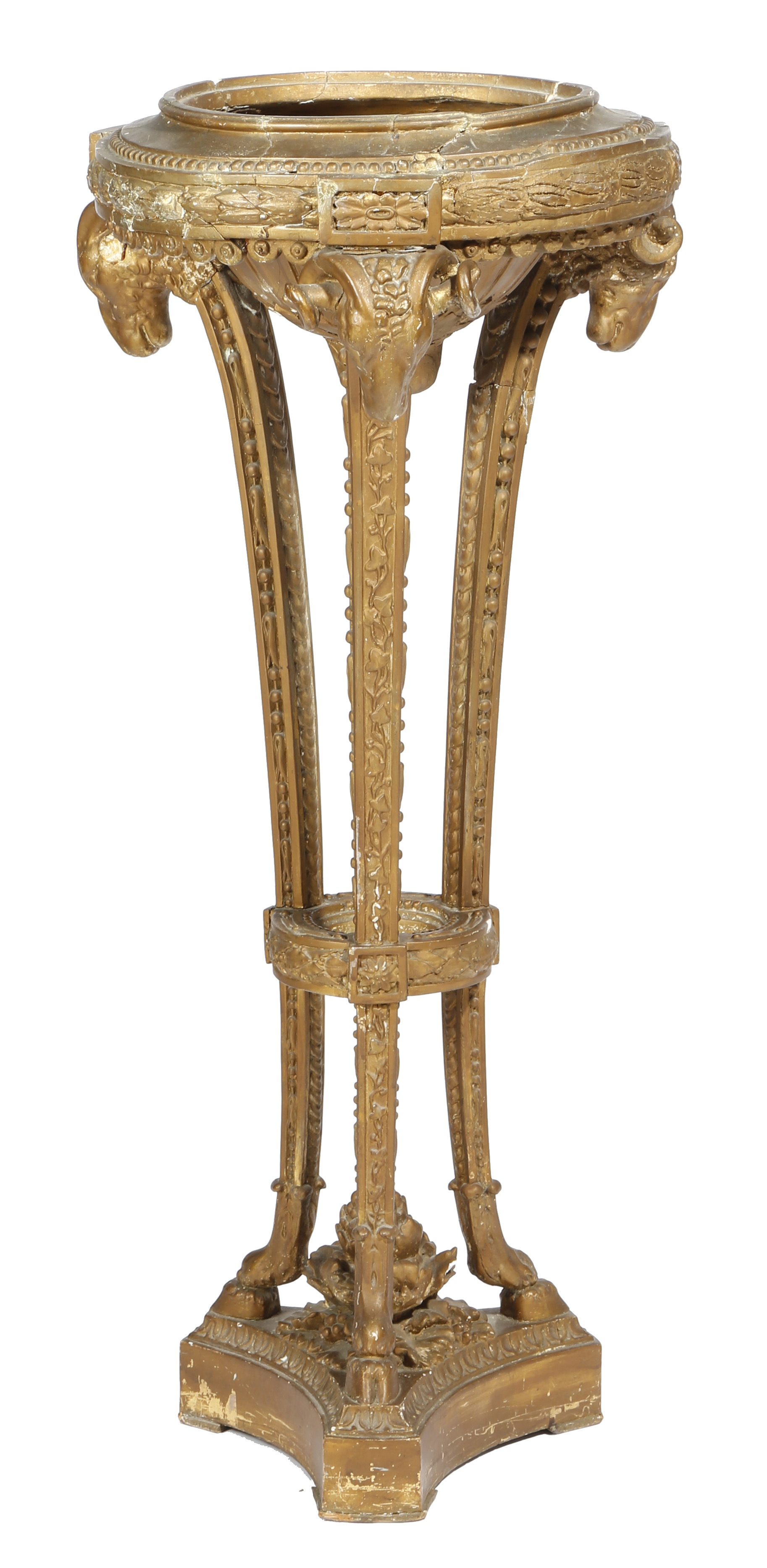 A Victorian gilt composition jardiniere stand in Adam style, in the form of an athenienne, with a metal liner, with beaded and laurel leaf bands, on ram's head tripod monopodia, 88.6cm high, 39cm wide.