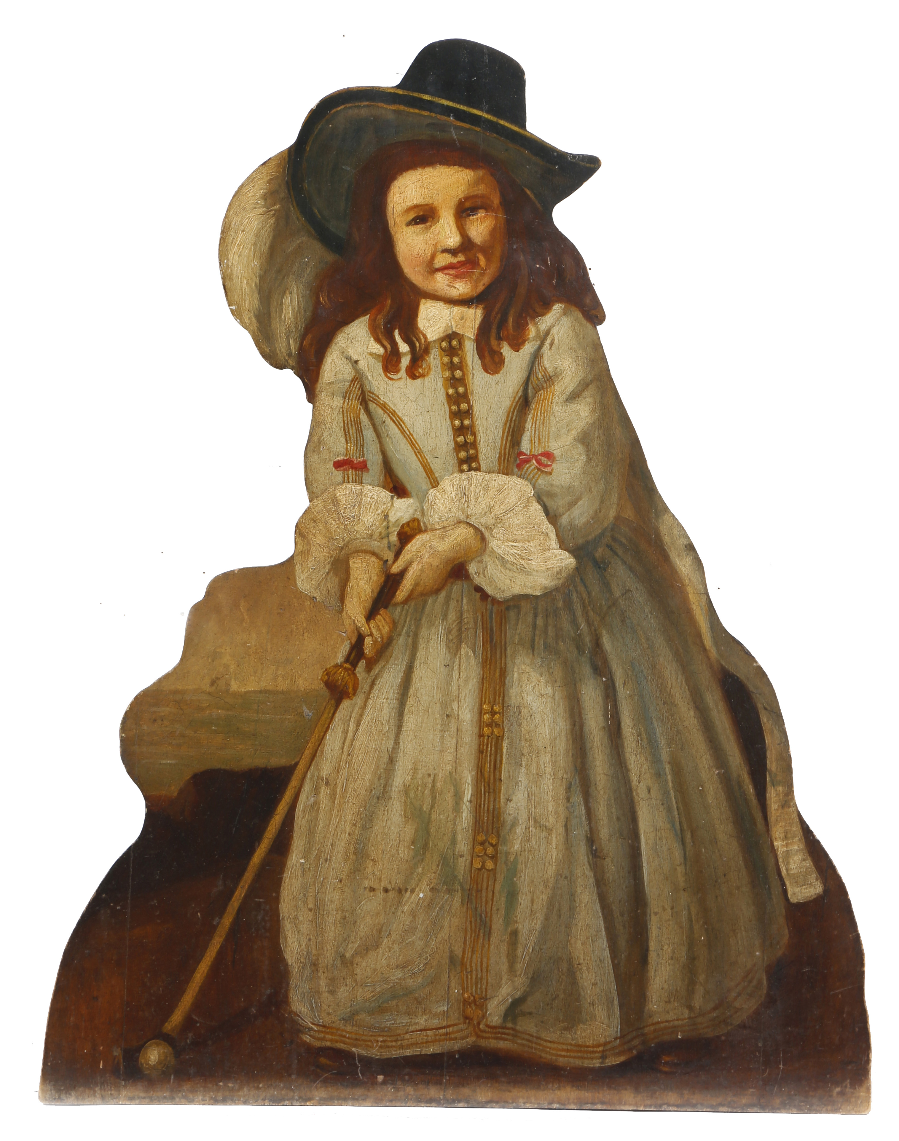 Golfing interest. A rare 19th century Dutch painted wood dummy board, depicting a a child playing golf after a painting by Aelbert Cuyp, 107 x 80.8cm.