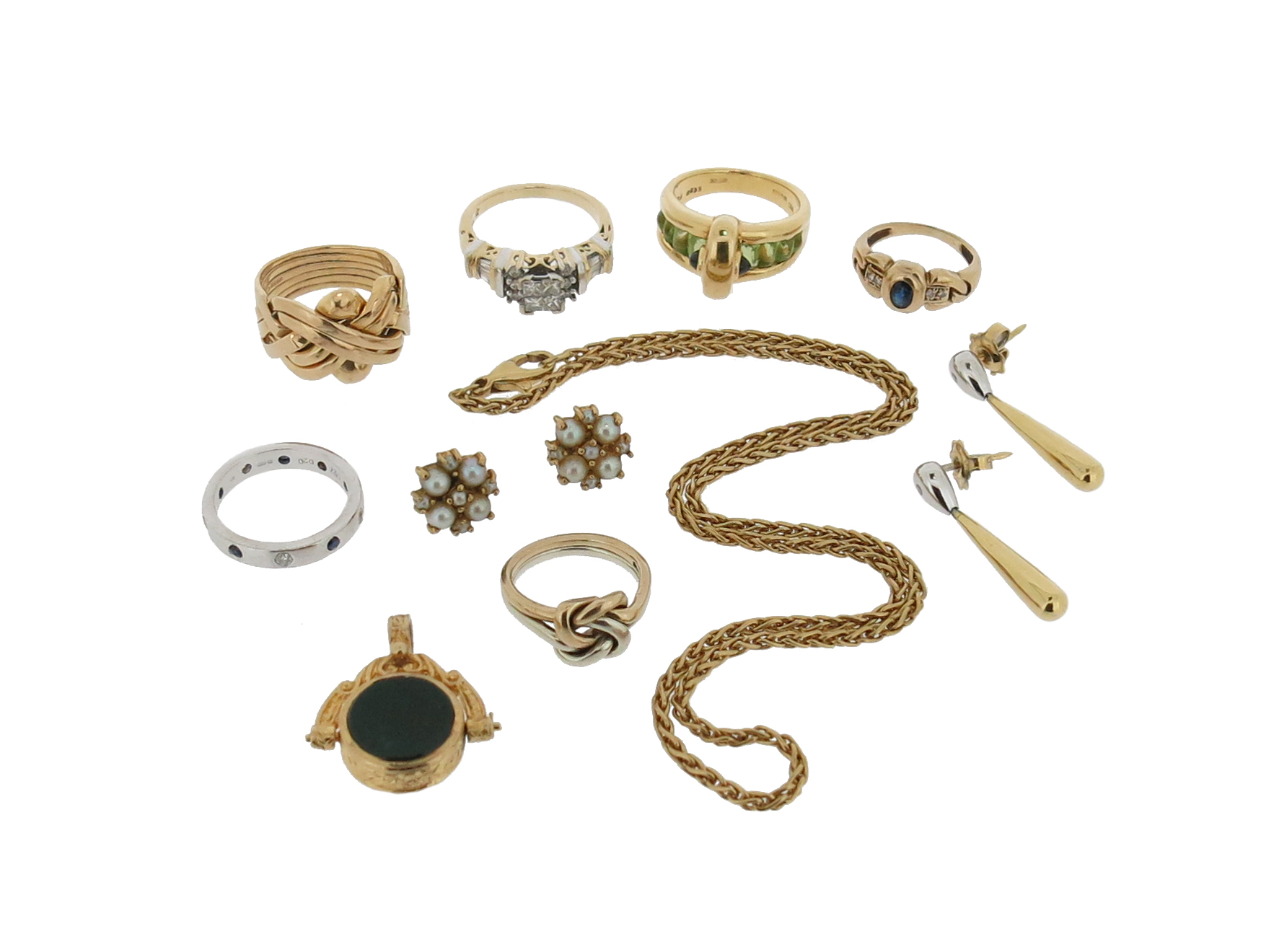 A mixed lot of jewellery, including a two-colour gold diamond cluster ring, set with four square-shaped diamonds and row of circular and baguette-shaped diamonds to each shoulder, size O, a sapphire and diamond cluster ring set in yellow gold, size G, a two-colour gold knot ring, size H approx., a yellow gold knot ring, a pair of seed pearl cluster earrings, a pair of 18ct two-colour gold drop earrings, each set with a circular-cut diamond, 3cm high, an 18ct gold fancy-link necklace, a 9ct white gold sapphire and diamond eternity ring, size L, a green-stone and sapphire cluster ring, size N 1/2 and a hardstone swivel fob seal
