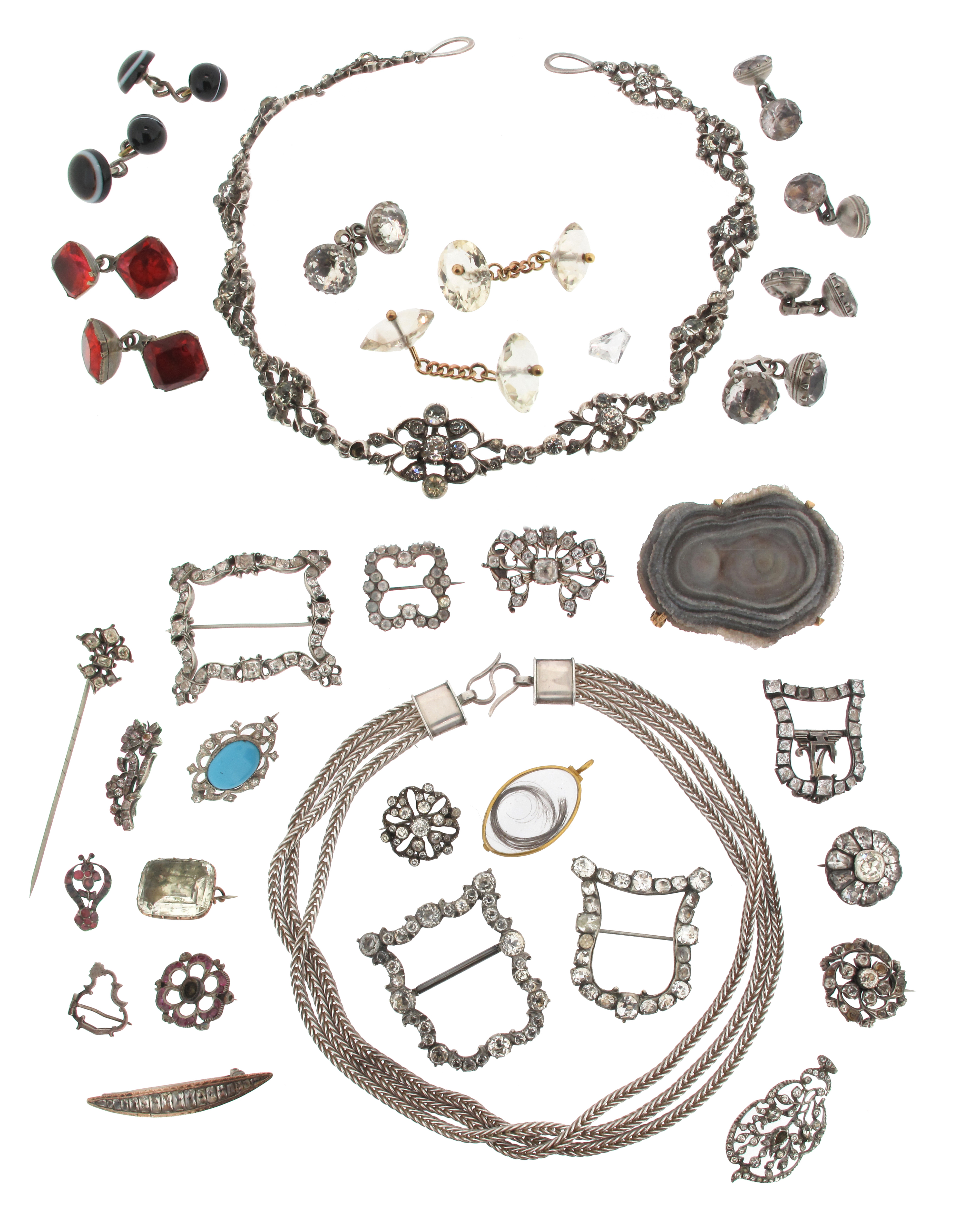 A collection of paste and silver items, including two pairs of 18th century faceted rock crystal-mounted silver cufflinks, another similar single cufflink, a pair of 18th century faceted orange paste-set silver cufflinks, a pair of oval faceted paste-set cufflinks, a pair of banded agate-mounted cufflinks, a paste-set silver necklace, 38cm long, a navette-shaped gilt metal hinged locket pendant, two late 18th century ruby-set brooches (one pin missing), assorted paste-set jewellery and an agate crystal brooch, together with a fancy-link silver choker length necklace marked for Alexandra Coppen, Sheffield 1995