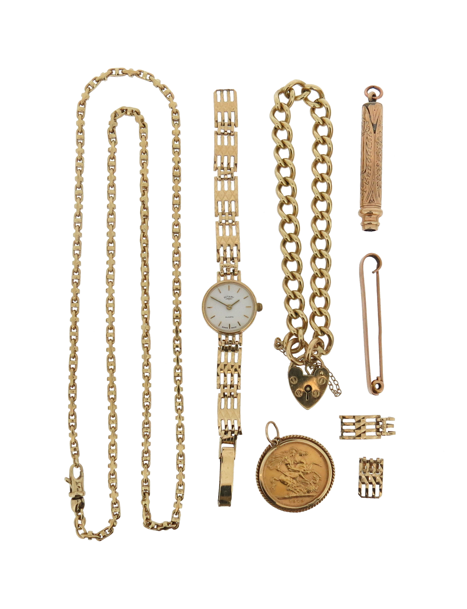 A 9ct gold curb-link bracelet, with heart-shaped padlock clasp, with a gold propelling pencil, a sovereign pendant, a gold neck chain, a gold bar brooch and a Rotary gold wristwatch with broken links, 75g total