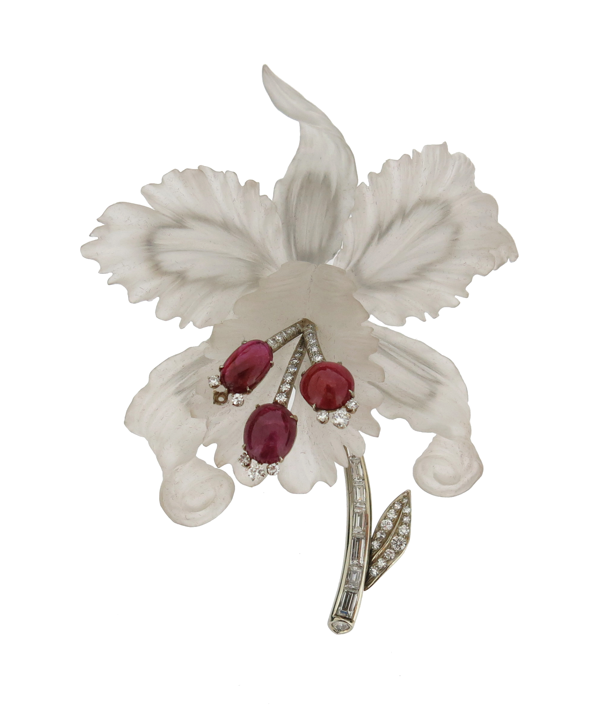 A rock crystal ruby and diamond brooch, the realistically carved rock crystal leaves are set with ruby cabochons, circular-cut diamonds (one missing) and with a baguette-shaped diamond stem in white gold, 11cm long