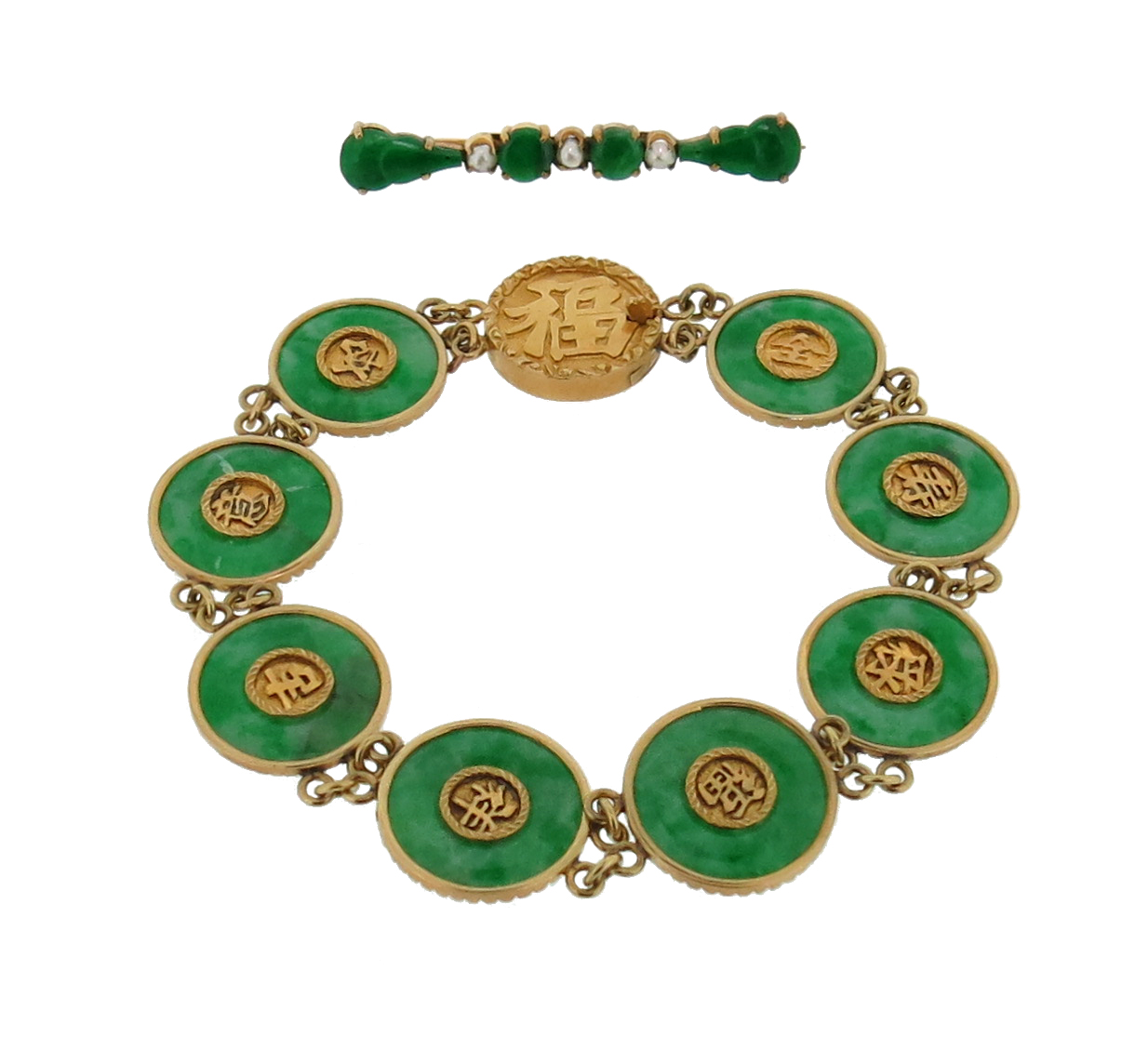 A jade and gold bracelet by WangHin, each link formed with a circular jade disc in yellow gold mounts and centred with a Chinese character, reading 'To have a long life that you've always wished for, full of luck, success and happiness', with maker's mark to the clasp, 20cm long, together with a jade and seed pearl bar brooch