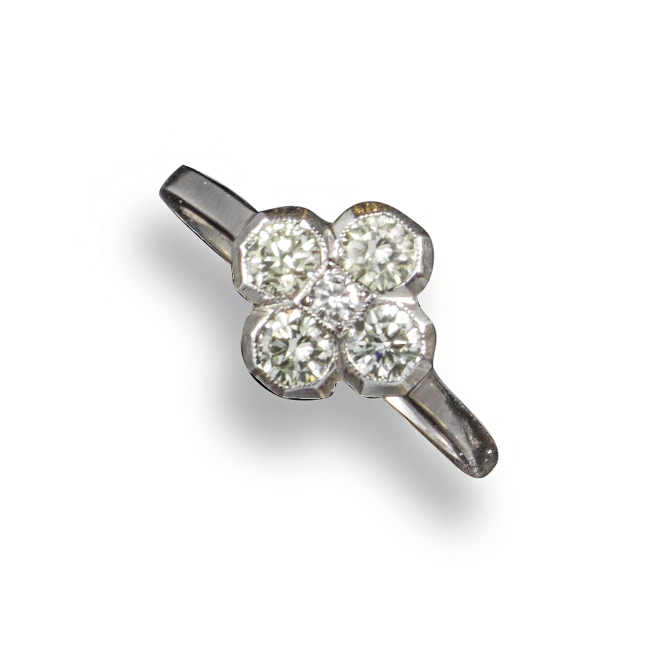 A diamond cluster ring, of quatrefoil form and set with round brilliant-cut diamonds in platinum, size O
