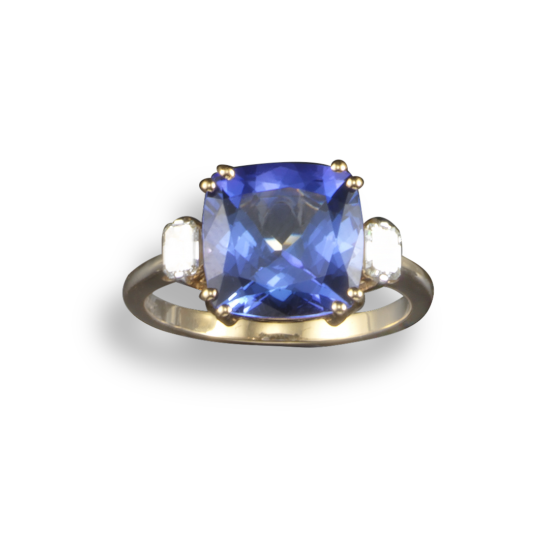 A tanzanite and diamond ring, the cushion-shaped tanzanite is set with emerald-cut shoulder diamonds in yellow gold, size N 1/2