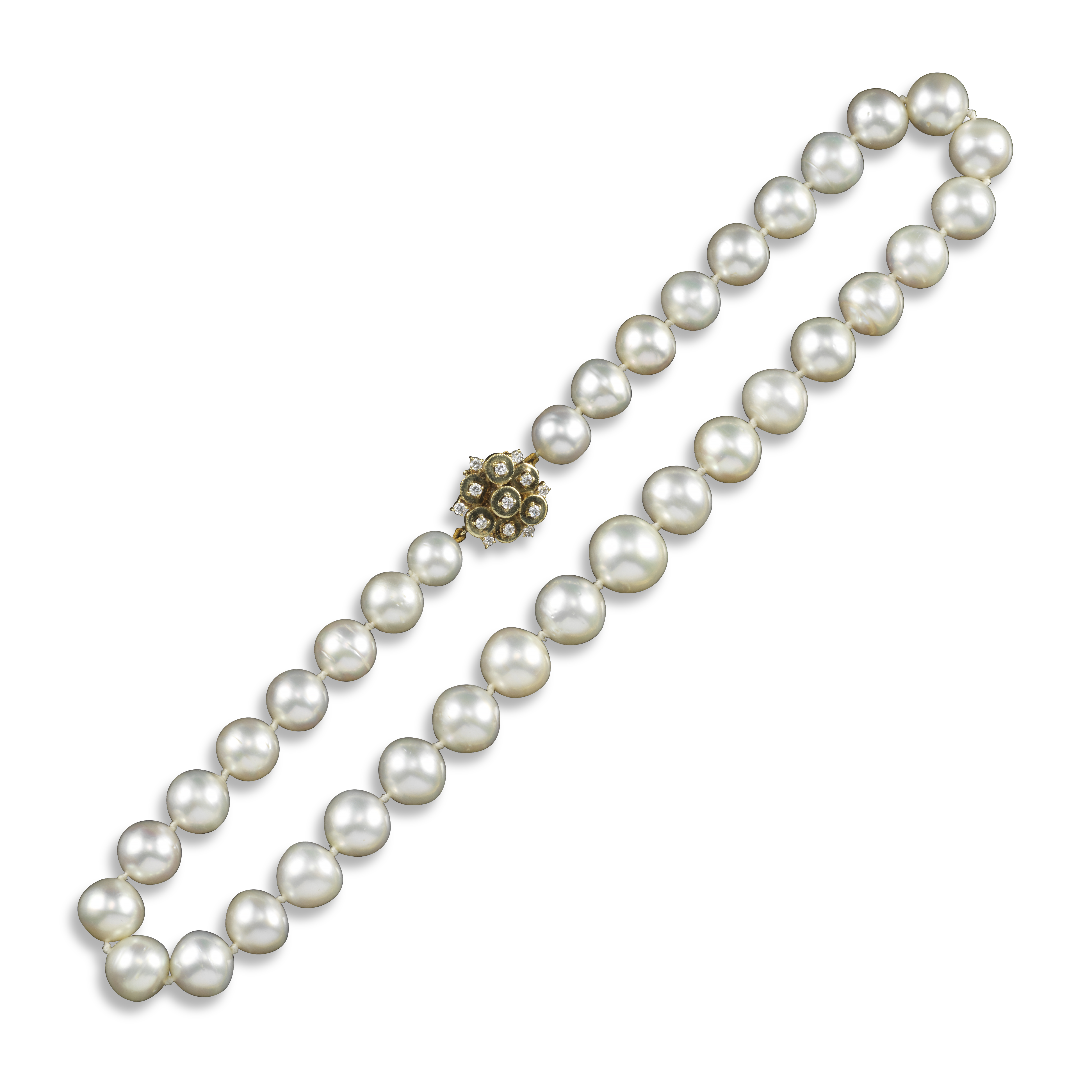 A single-row graduated cultured pearl necklace, the pearls graduate from 10 - 14mm, with 14ct yellow gold clasp set with small round diamonds, 47cm long