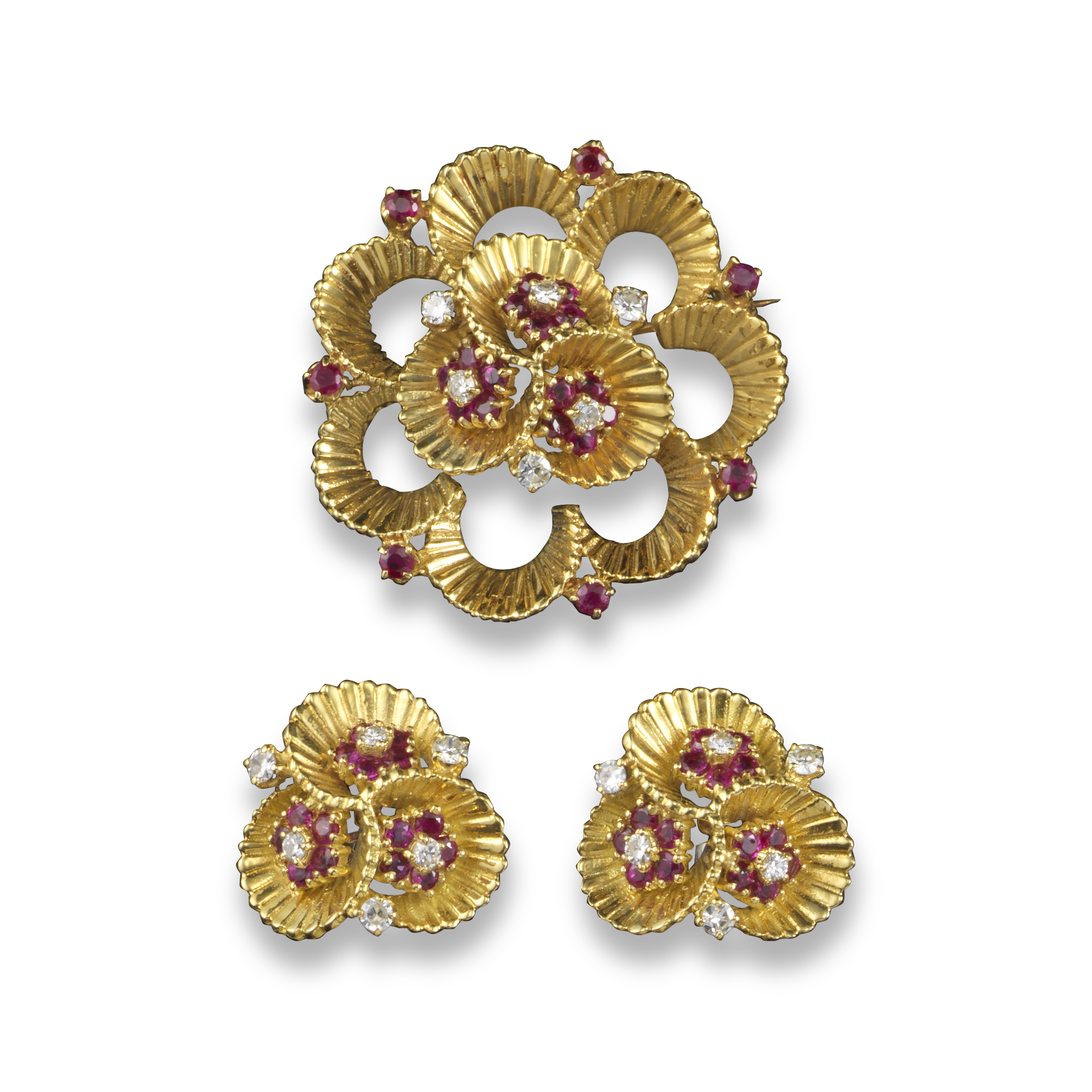 An 18ct yellow gold circular brooch and earrings by Ben Rosenfeld Ltd, designed as stylised pencil shavings and set with circular-cut diamonds and rubies, the brooch with London marks for 1964, brooch 4cm wide