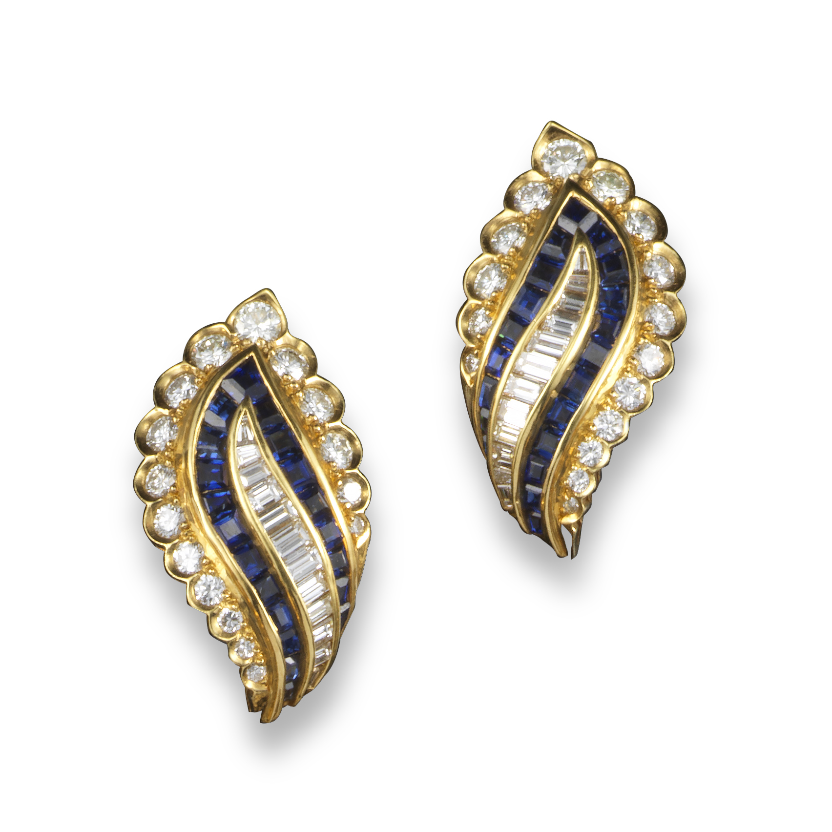 A pair of sapphire and diamond earrings by Adler, of stylised leaf design, set with baguette-shaped and circular-cut diamonds and calibre-cut sapphires in yellow gold, signed adler to reverse, clip fittings, 3cm high