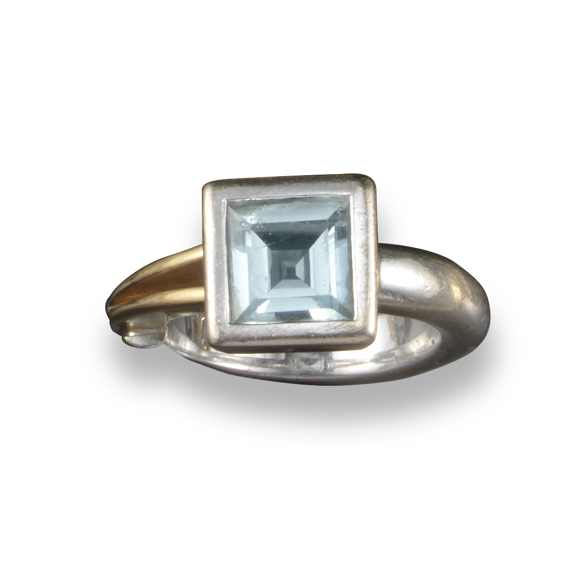 An aquamarine dress ring, the square-shaped aquamarine is bezel-set in white gold, with plain white gold shank and bifurcated yellow gold shoulder to one side, size N 1/2