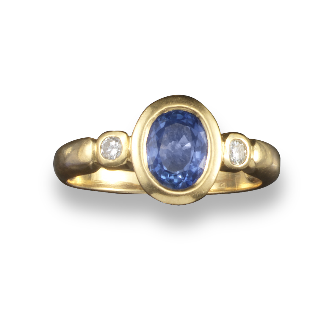 A French sapphire and diamond three-stone ring, the oval-shaped sapphire is rubover-set with circular-cut shoulder diamonds in yellow gold, with French control mark and maker's lozenge 'Ste O & D', size X