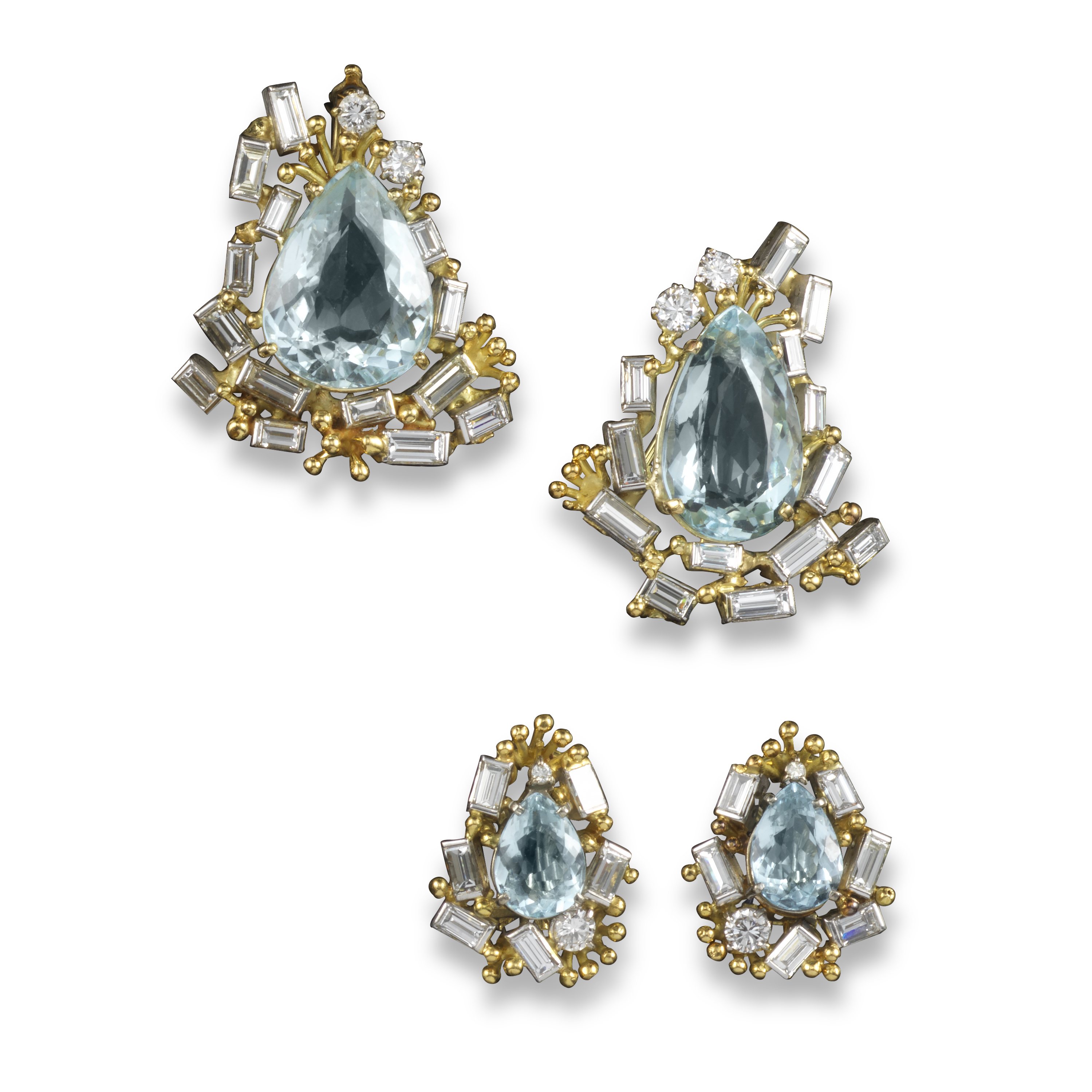 An abstract blue topaz and diamond pendant, the pear-shaped blue topaz set within gold pellet border and graduated baguette-shaped and circular-cut diamonds in yellow gold and platinum, 3.8cm high, with a matching blue topaz and diamond brooch, 4cm wide and a pair of aquamarine and diamond earrings, clip fittings, 2.5cm high