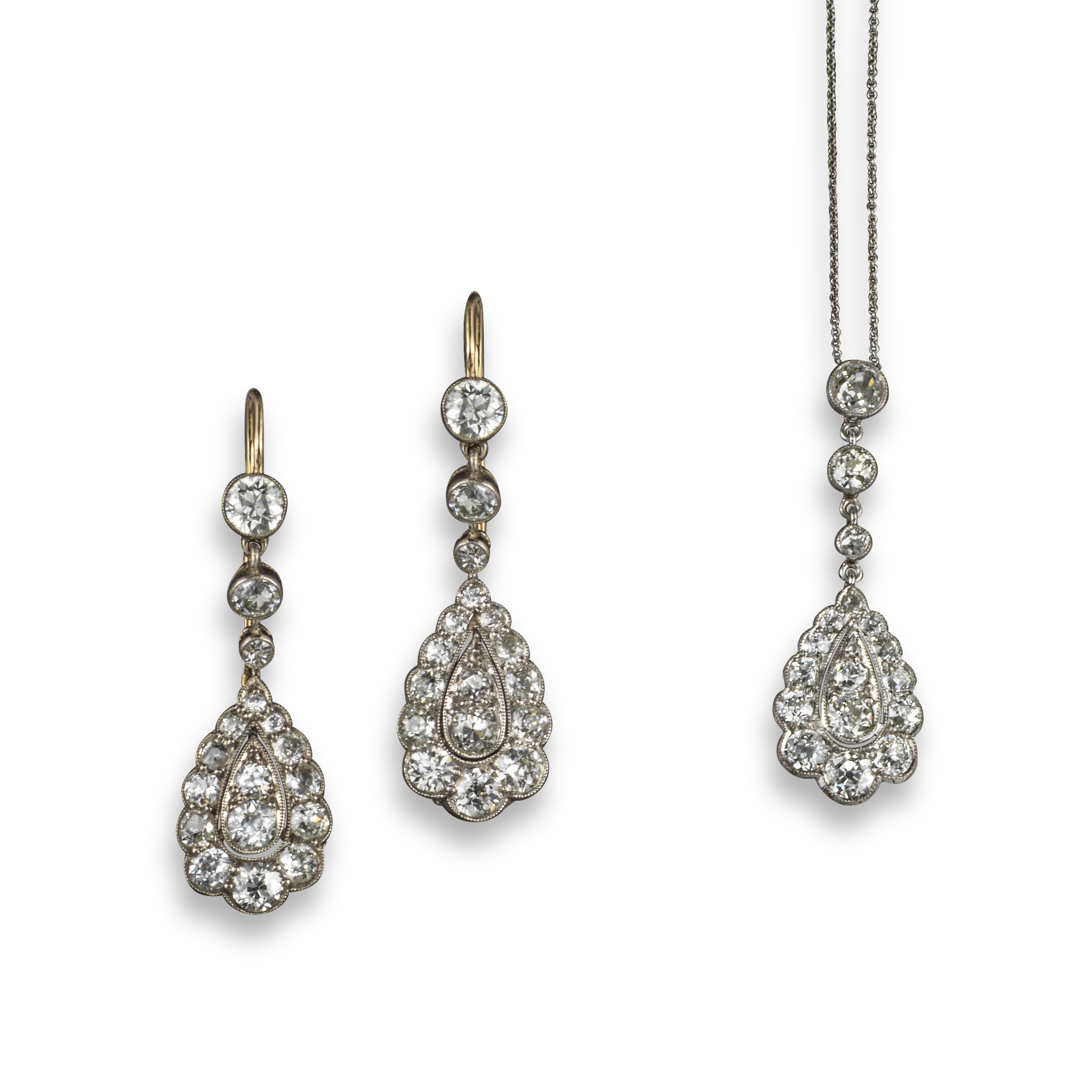 An Edwardian diamond-set pendant with matching drop earrings, the pear-shaped pendant centred with three old circular-cut diamonds millegrain-set within a surround of twelve further graduated old circular-cut diamonds and suspending from an articulated line of three diamonds on a fine-link platinum neck chain, with a pair of matching diamond drop earrings, set in platinum with gold hooks
